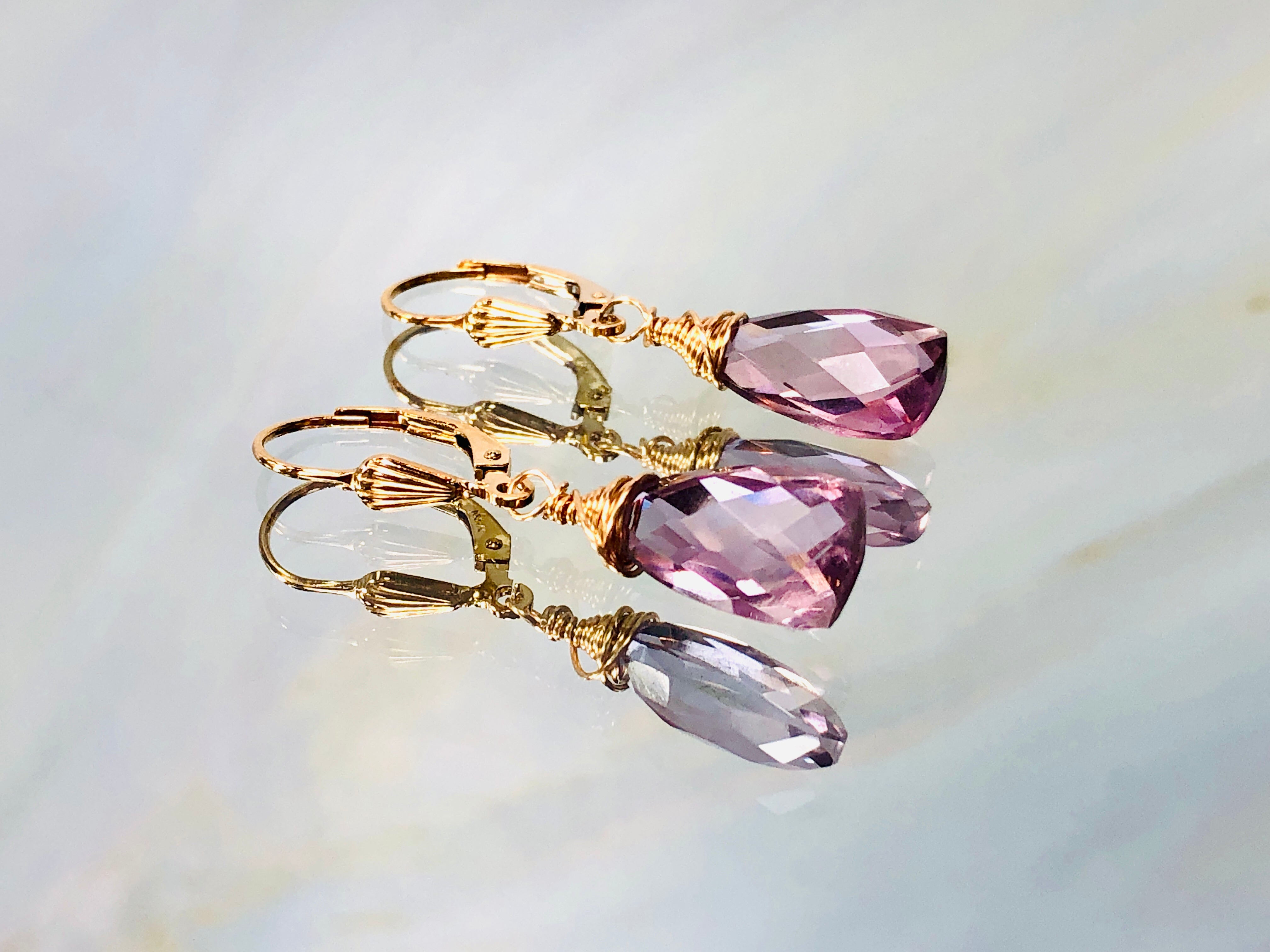 Gold Pink Amethyst earrings, Pink Amethyst Gold Lever back Earrings