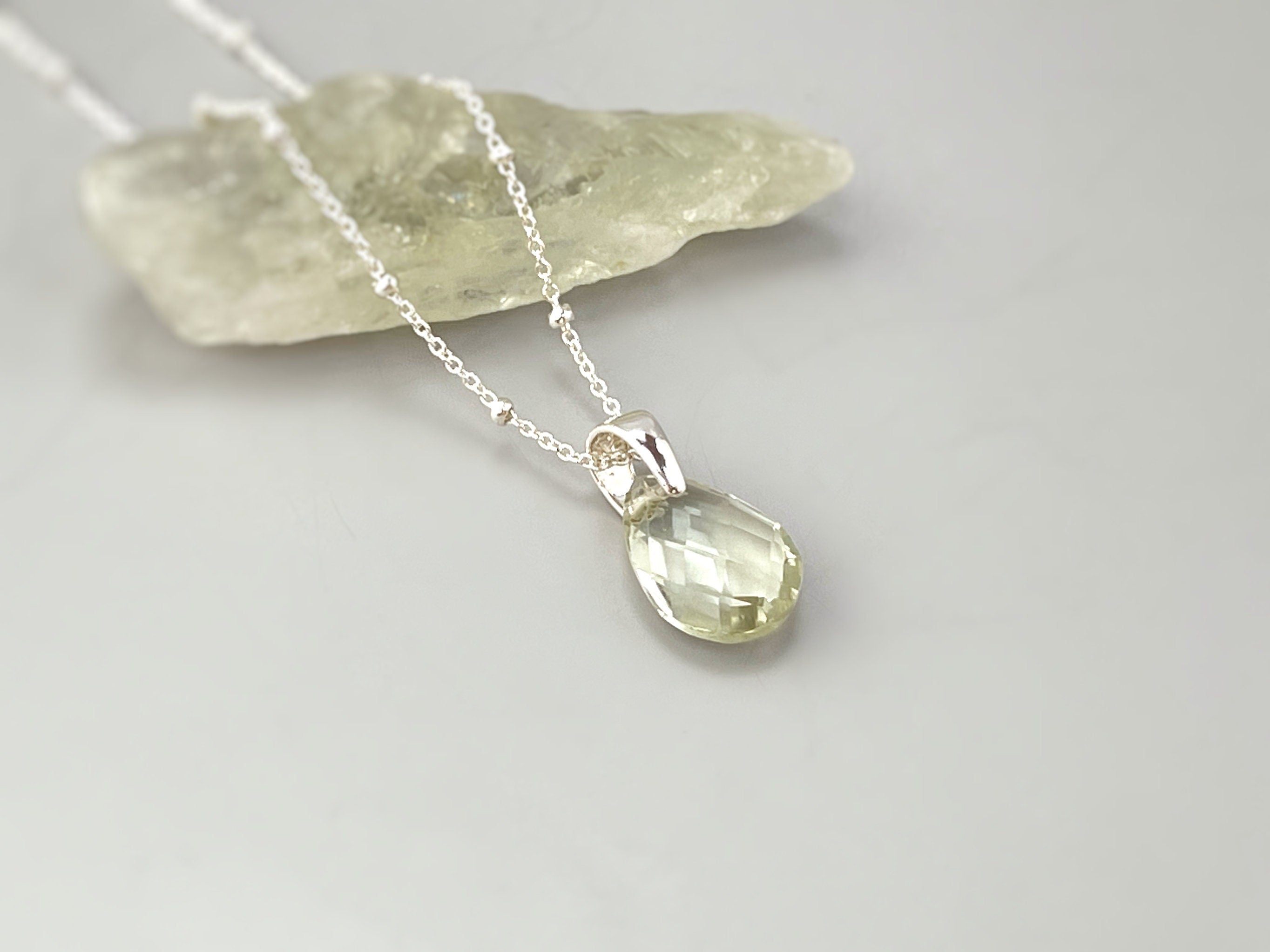 Handmade genuine green amethyst necklace. Dainty solitaire necklace. A sparkling soft sage mint green amethyst (also called Prasiolite) gemstone set on a sterling silver bail on a matching curb chain. A simple, elegant handmade necklace perfect for everyday wear. The matching earrings are available in our store. A lovely gift for a wife wife, girlfriend or mom or sister.