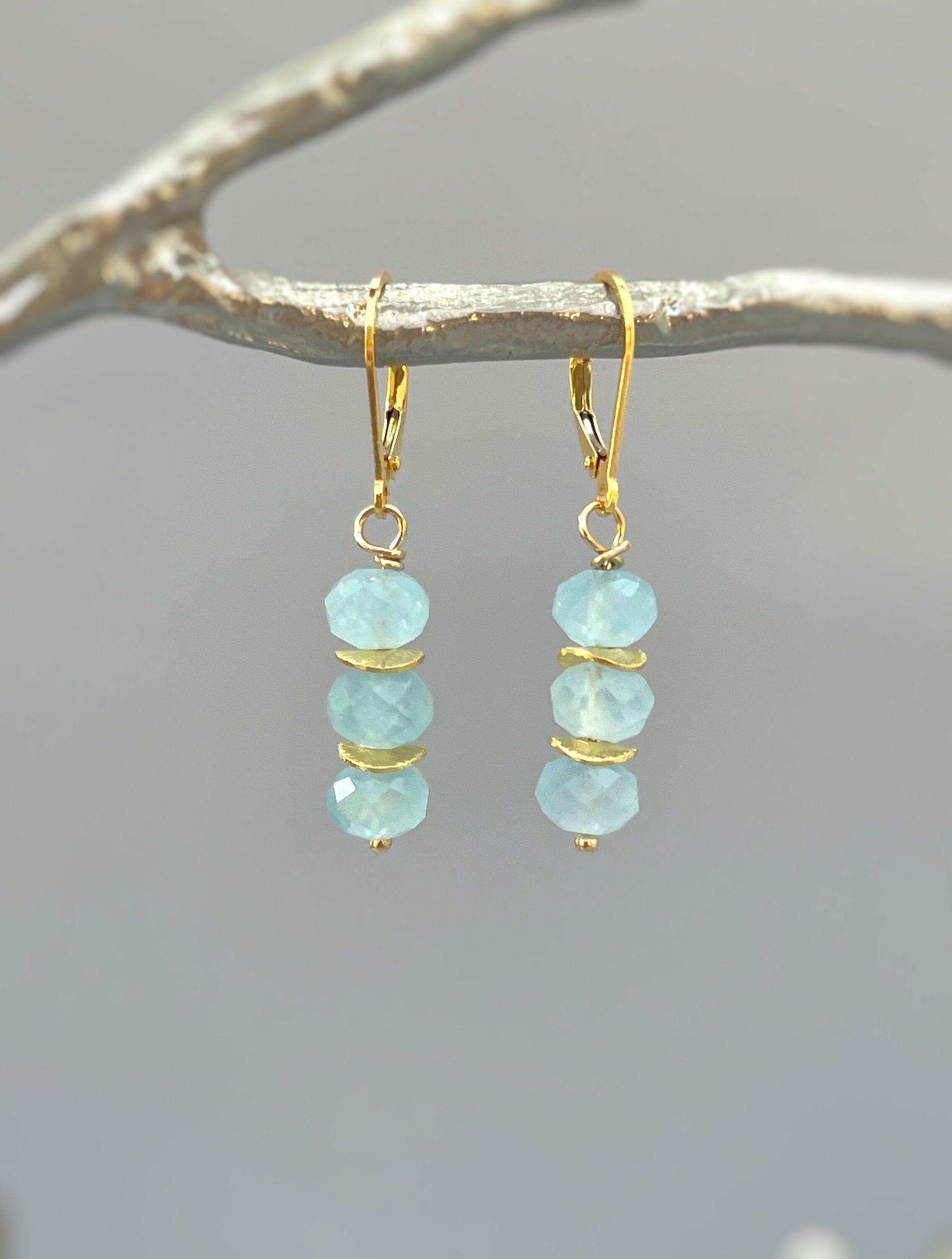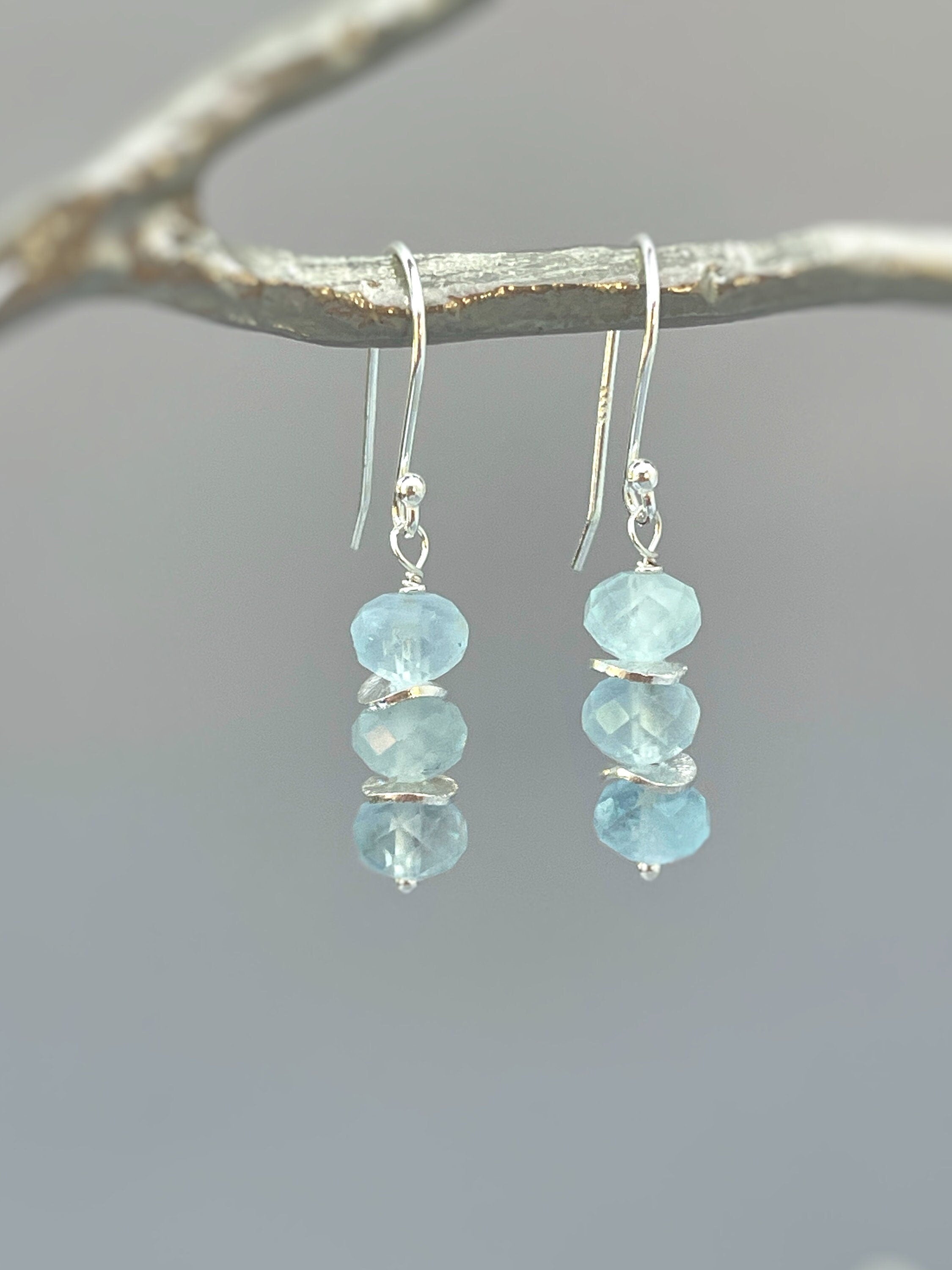Dainty handmade genuine aquamarine dangle earrings in blush pink Rose Gold Fill. Lightweight earrings for women. Sparkling aquamarine blue gemstone rondelles hang from your choice of Sterling Silver, 14k gold Fill, or Rose Gold Fill French hook ear wires or leverbacks. Gemstone drops are dainty approx 1/4" wide. Simple, elegant everyday earrings. These would make a lovely gift for mom or wife with a March birthday also something blue bridal earrings or bridesmaids gifts.