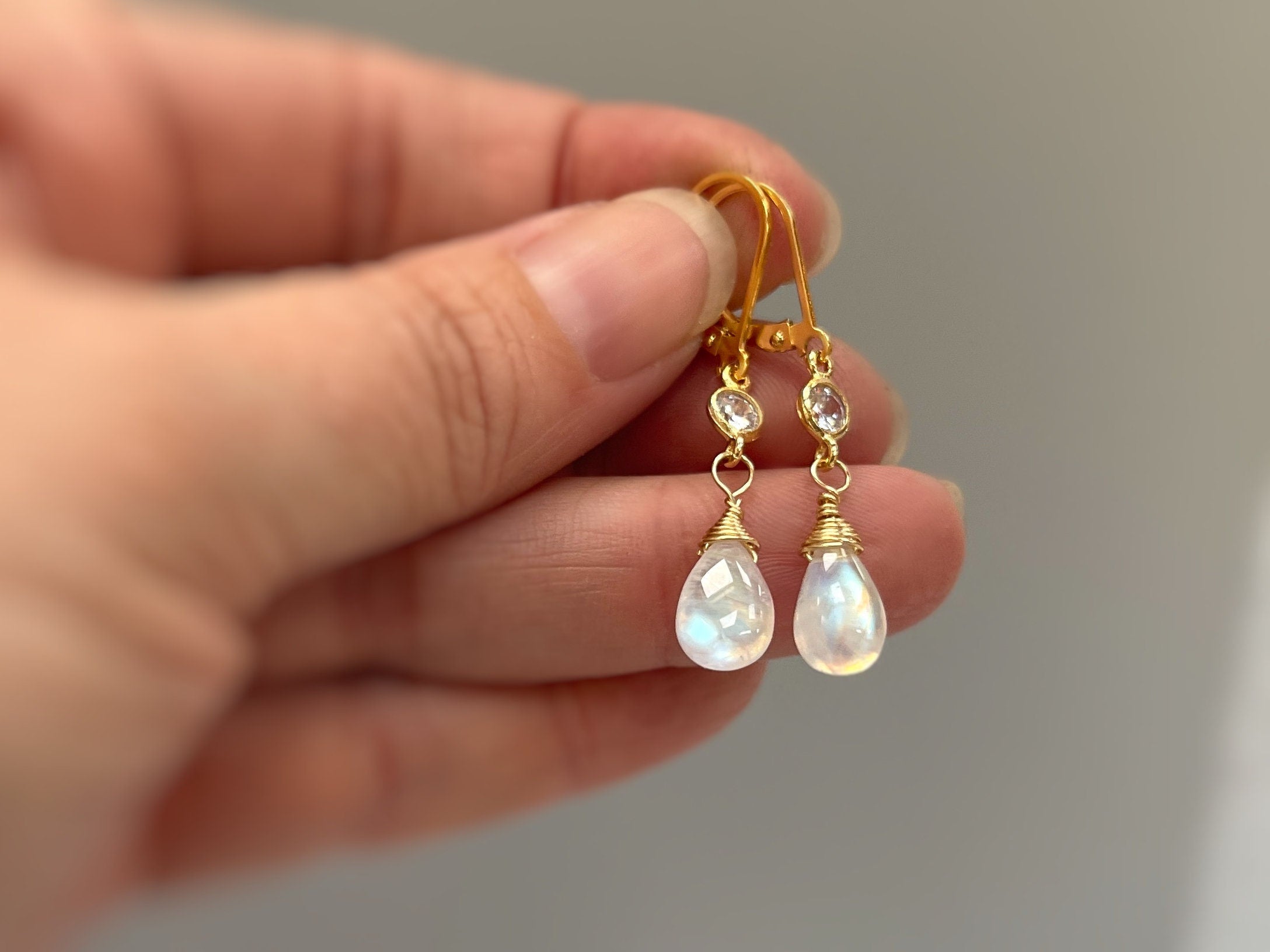 Dainty handmade crystal moonstone Dangle earrings. Tiny Moonstone gemstone tear drops wire wrapped in 14k gold fill and hang from sparkling crystals Matching French hook or leverback earring backs available. Gemstone drops are dainty approx 8x6mm. Simple, elegant everyday earrings. These would make lovely bridal or bridesmaid gift earrings.