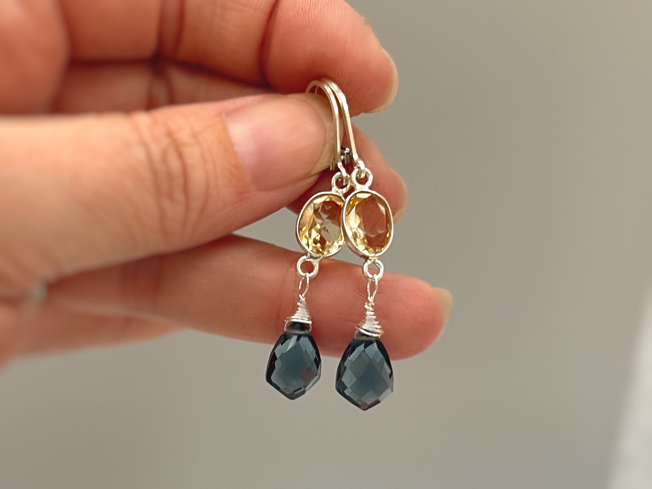 Citrine London Blue Topaz earrings dangle, Sterling Silver