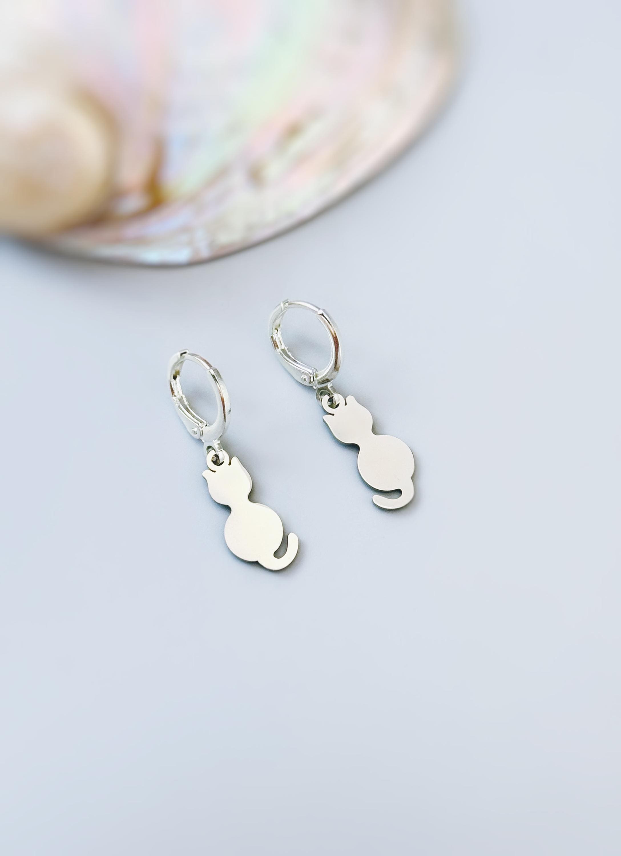Dainty Cat Earrings dangle gold Huggie Hoops handmade silver kitten jewelry unique gift for cat moms, animal lovers veterinarians, vet techs