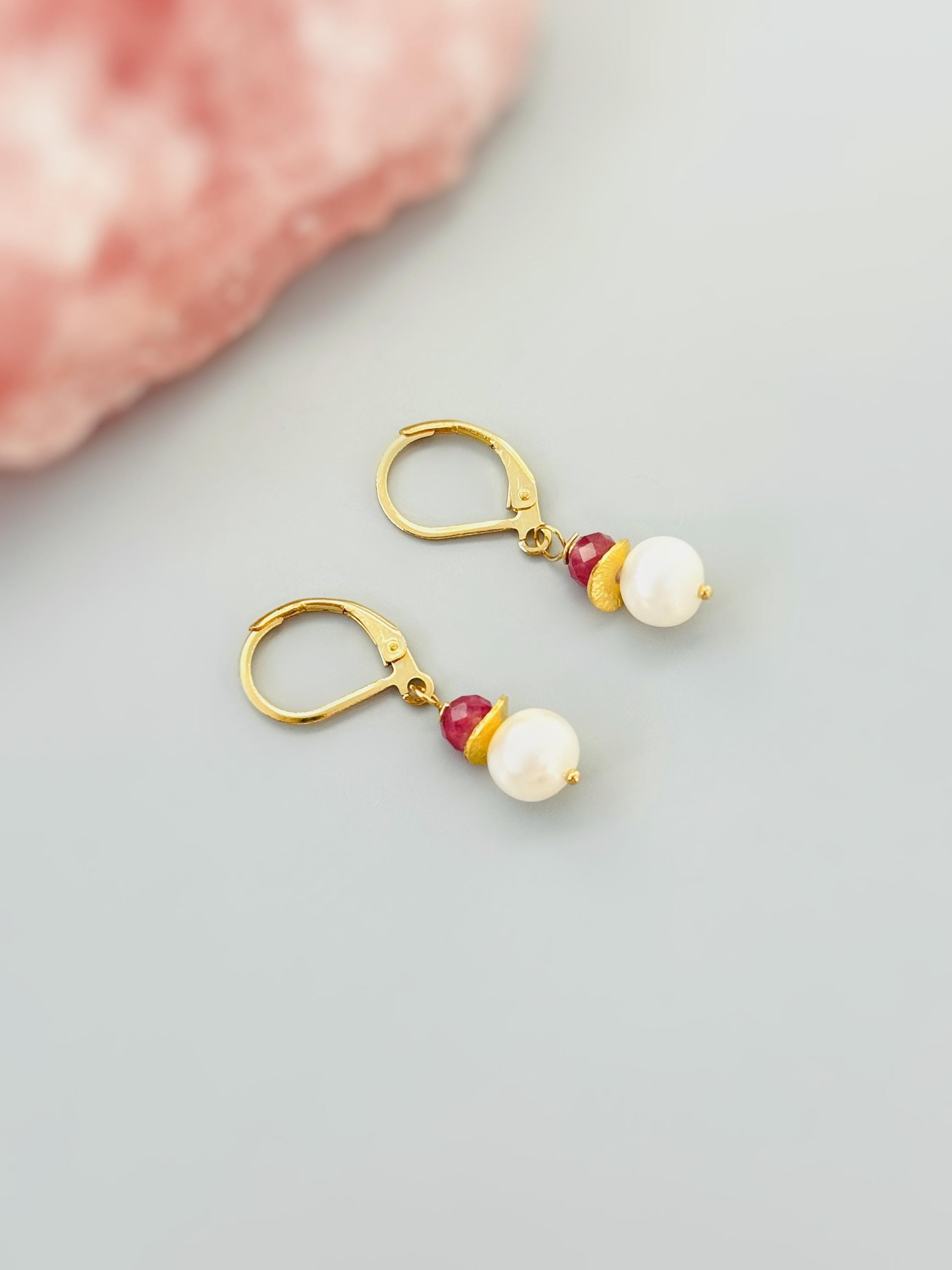 Dainty genuine pink sapphire and freshwater pearl earrings in 14k gold fill or sterling silver. Facetted genuine pink sapphire gemstones are paired with freshwater pearls and nested into your choice of 14k Gold Fill, Sterling Silver, Rose Gold fill caps and hang from matching leverbacks or Ear Wires. A lovely gift for a wife or mom with a September Birthday.