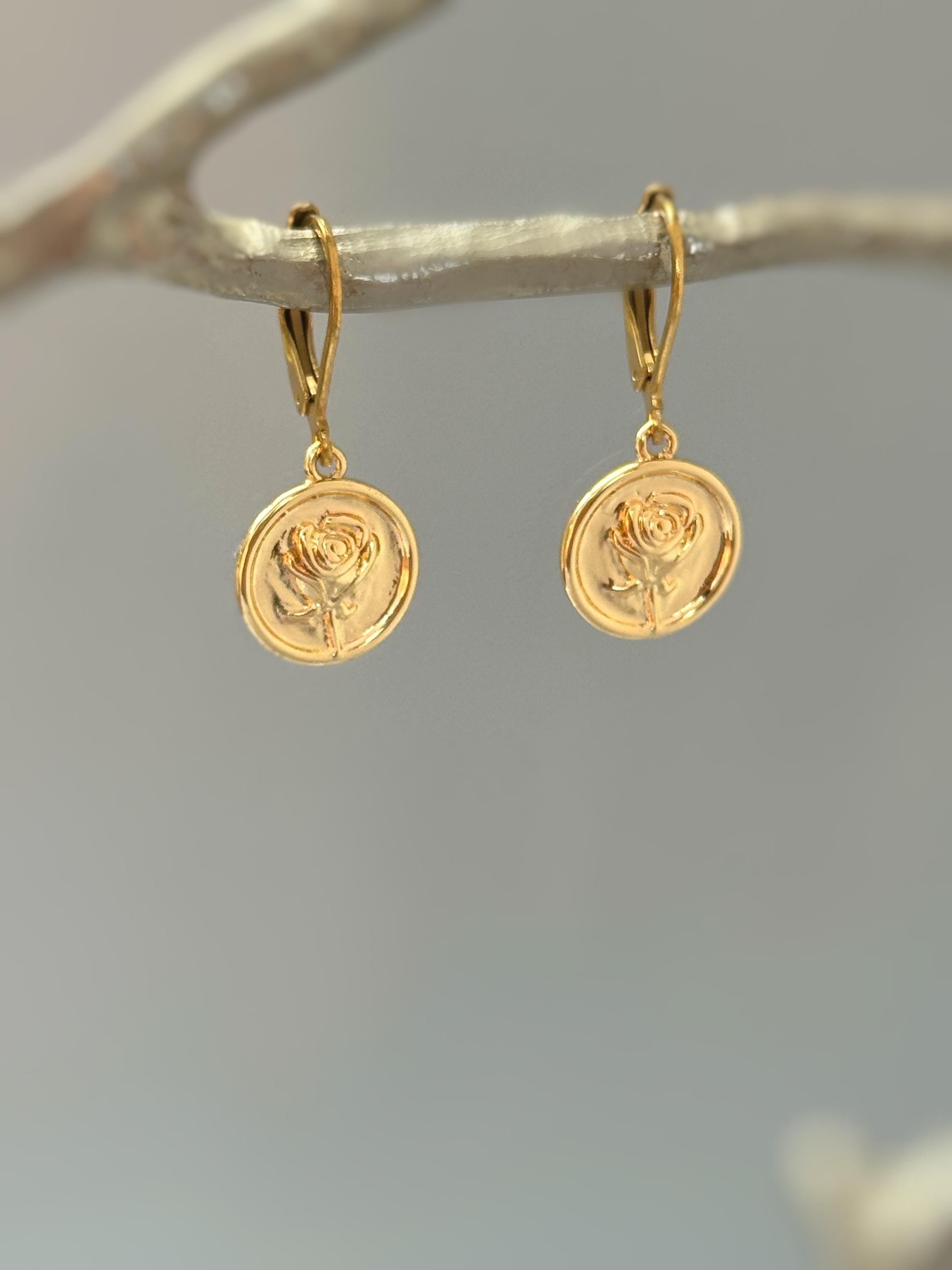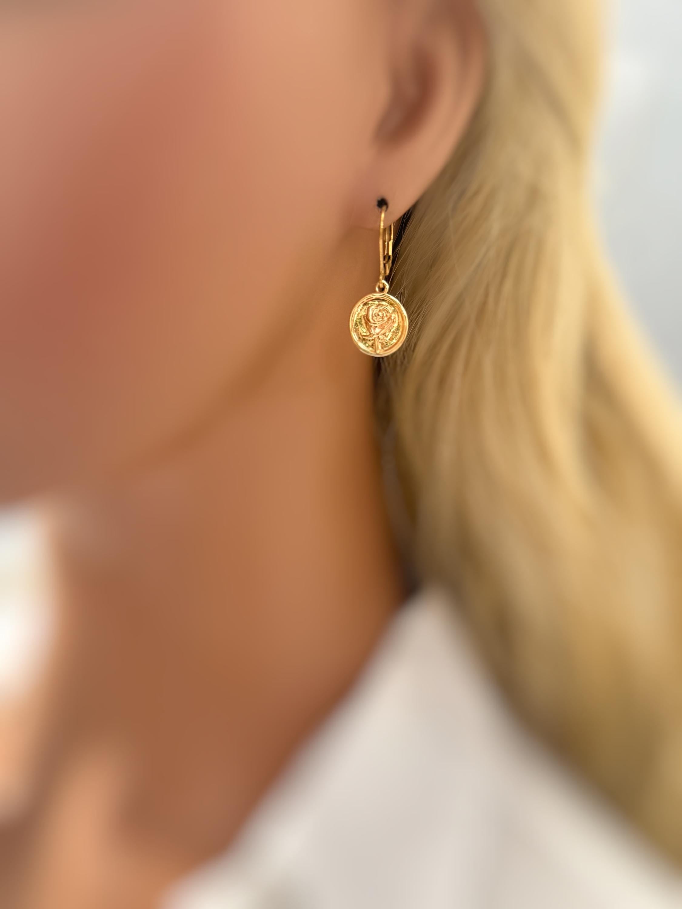Handmade Gold Rose Earrings on your choice of leverbacks or ear wires. June Birthflower floral Jewelry. An elegant romantic gift for girlfriends, 18k gold plated over sterling silver earring backs.