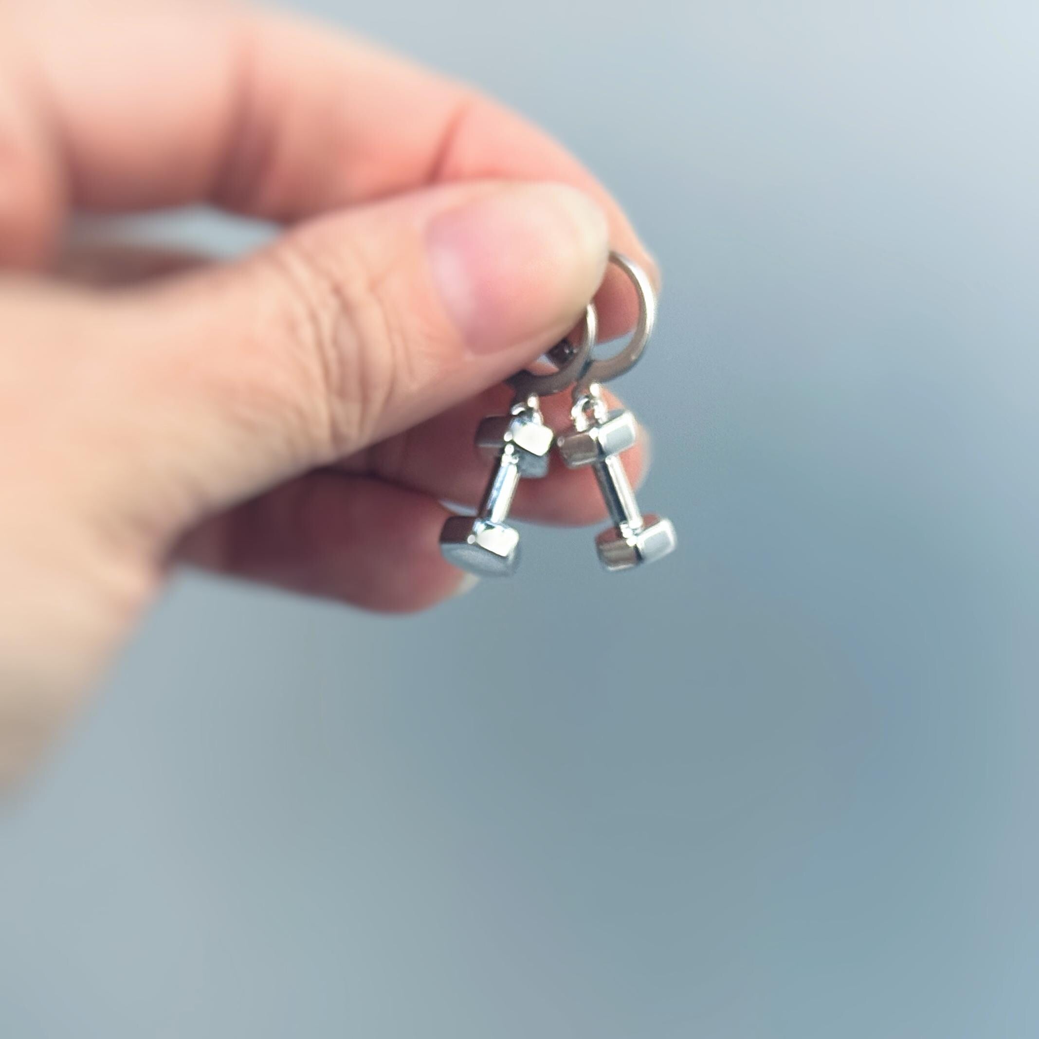 Gold, Silver Dumbbell Earrings Huggie Hoop dangle unique fitness accessories gym gift for personal trainers powerlifters, weightlifters, her