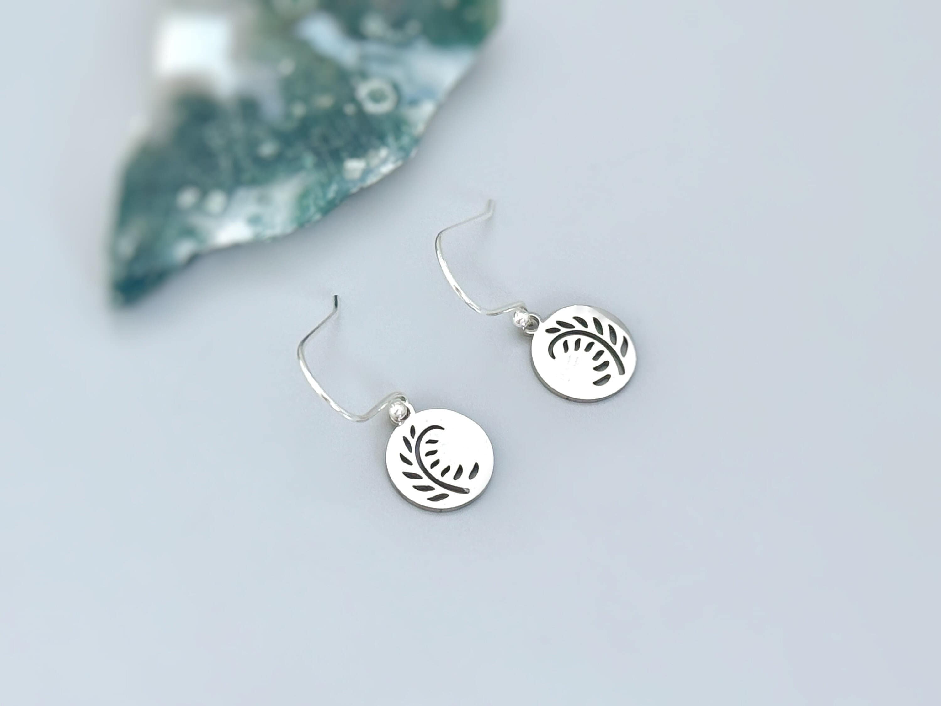 Handmade Silver Leaf Fern Dangle earrings. These botanical earrings are the perfect gift for plant moms and nature lovers. Minimalist modern jewelry for women. Silver ferns hang from matching Sterling Silver, ear wires or leverback earrings. Also available on silver plated huggie hoops.