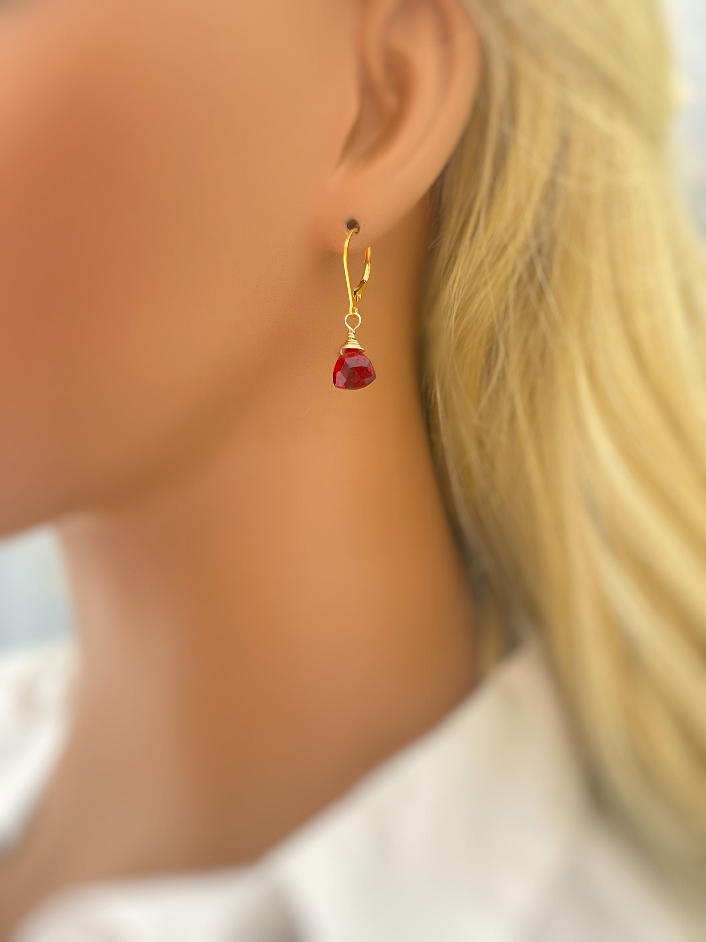 Handmade Ruby Red Quartz Dangle earrings. Sparkling ruby red quartz gemstone tear drops are set in your choice of sterling silver or 14k gold fill and hang from matching French hook or leverback ear wires. Gemstone drops are dainty approx 8x8 mm . Simple, elegant everyday earrings with lots of sparkle! The earrings would make a wonderful gift for a wife or girlfriend with a July birthday.