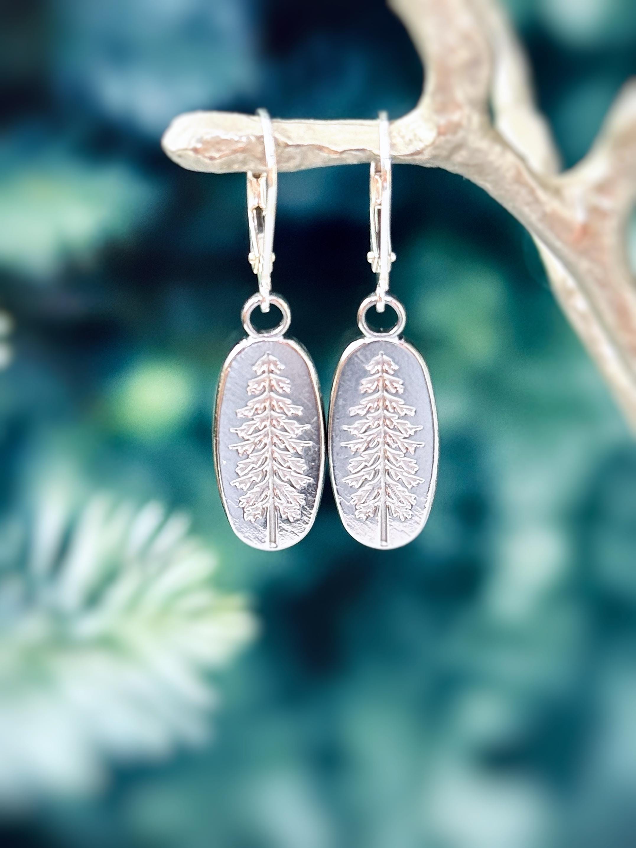 Handmade Silver Pine Tree earrings. These elegent winter pine tree earrings hang from your choice of 925 Sterling Silver or Silver plated leverbacks or ear wires. A lovely gift for a party host or festive holiday party jewelry.