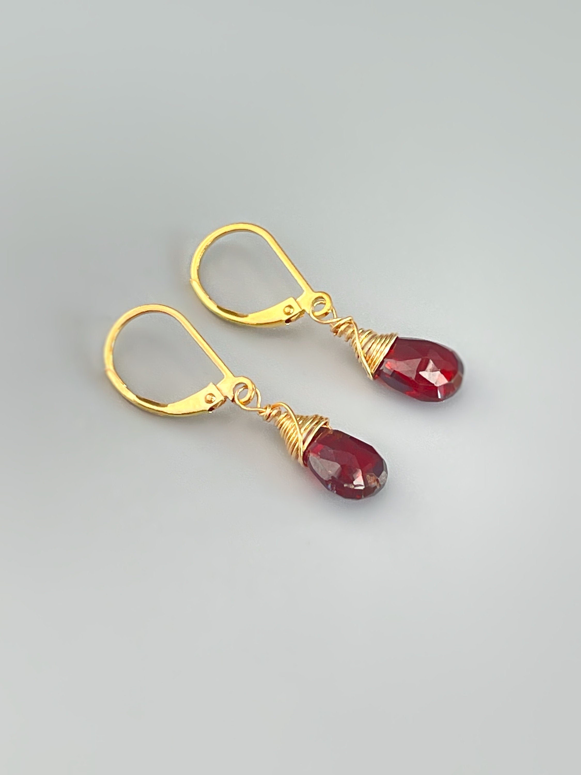 Handmade Garnet Earrings. Dainty genuine garnet gems are wrapped in your choice of 14k gold fill or sterling silver wire and hang from 14k gold fill or sterling silver leverbacks. Solid 14k Gold also available at additional cost.