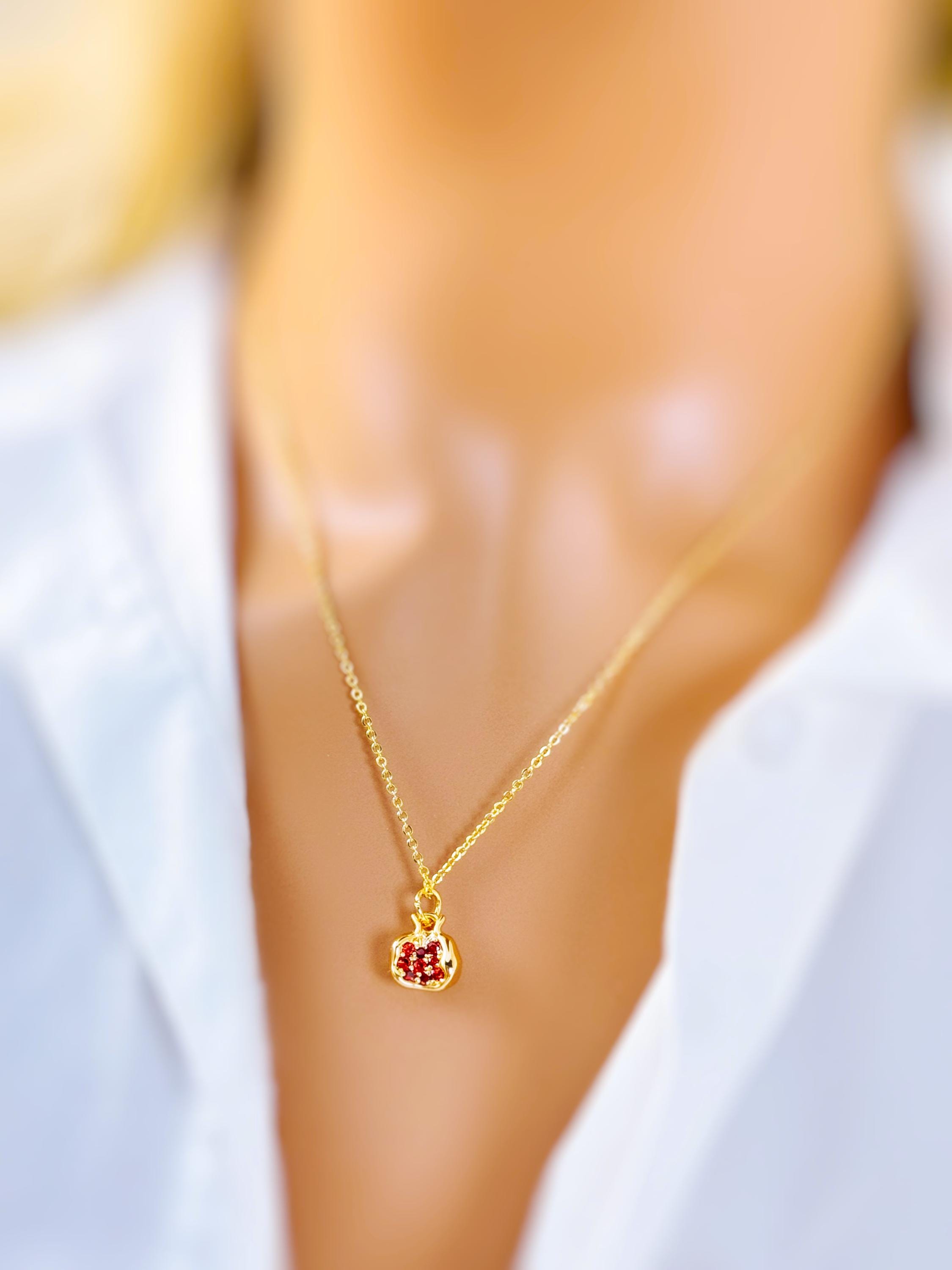 Gold Pomegranate Necklace silver handmade cute red garnet Fruit Jewelry unique charm pendant gift for foodie, chef, mom Judaica jewelry