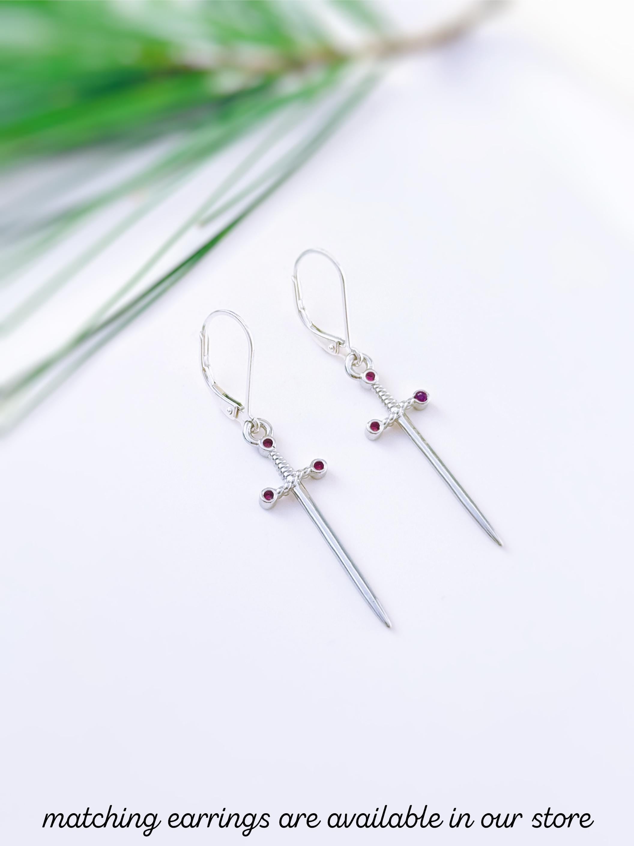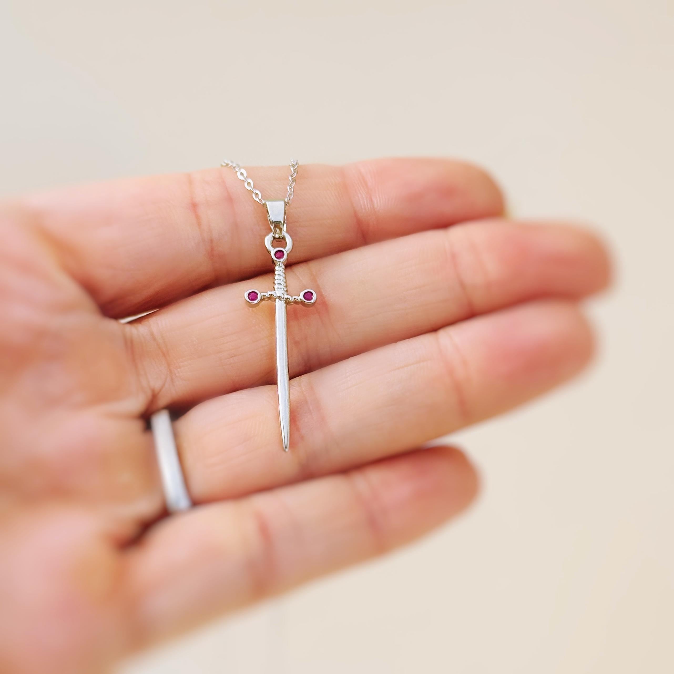🗡️ Channel your inner strength and elegance with this dainty sword necklace featuring a deep garnet-colored cubic zirconia set into the handle. Available on your choice of a silver-plated or sterling silver chain, or as a pendant alone, this piece is a perfect blend of delicate beauty and bold symbolism.