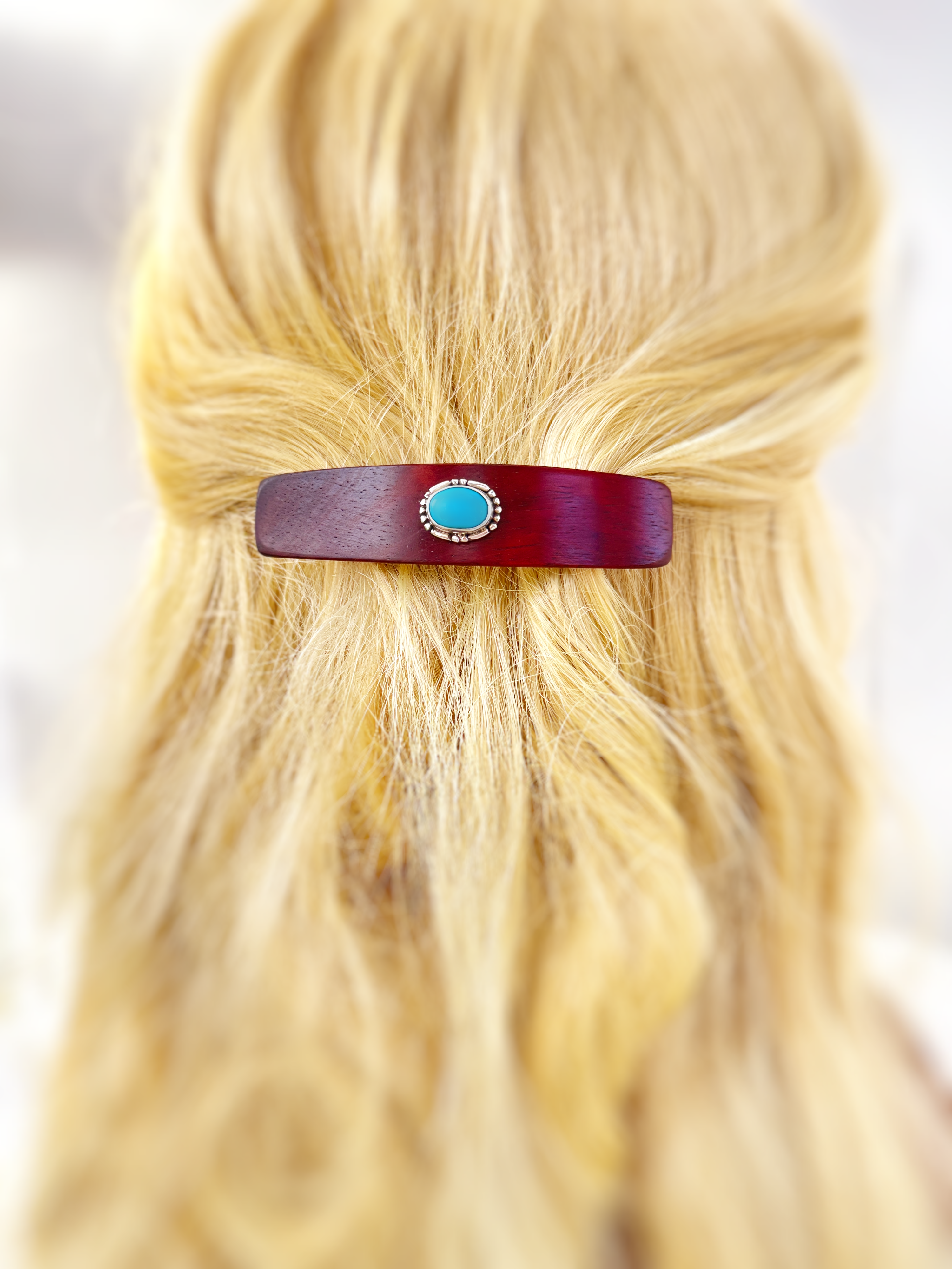 This elegant barrette is hand sculpted in Borneo Rosewood. A lovely pinky red color wood. I then add a turquoise gemstone in a simple, elegant sterling silver setting.