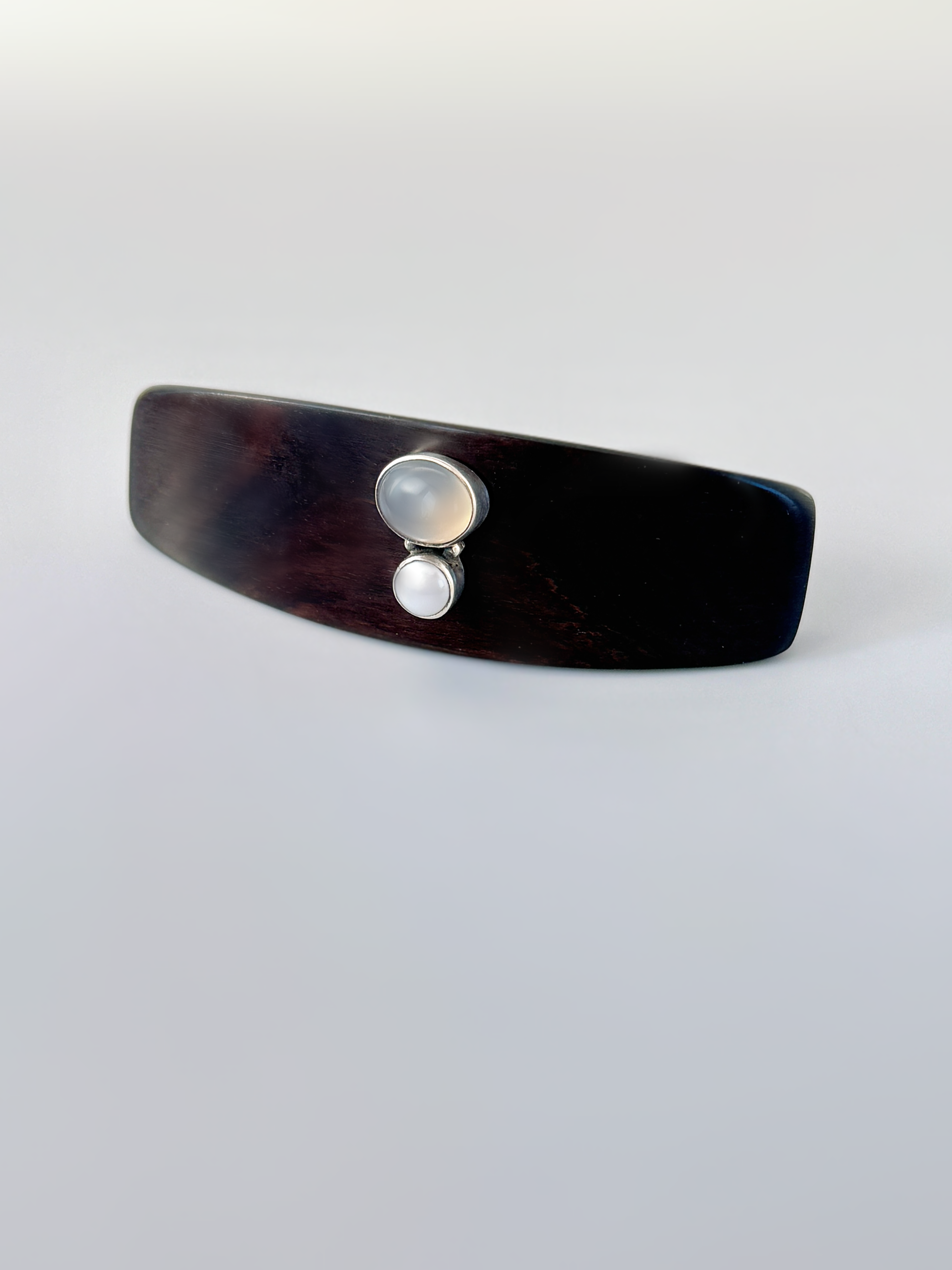 Handmade sterling silver and gemstone wood hair clip. This elegant barrette is hand sculpted in finest quality, musical instrument grade, black Ebony (Diospyros crassiflora) from Africa. I then add a lovely chalcedony gemstone and a flat backed genuine pearl set in sterling silver. A simple elegant design perfect for women with long hair. Our wood and gemstone hair clips are all limited edition and typically sell out quickly.