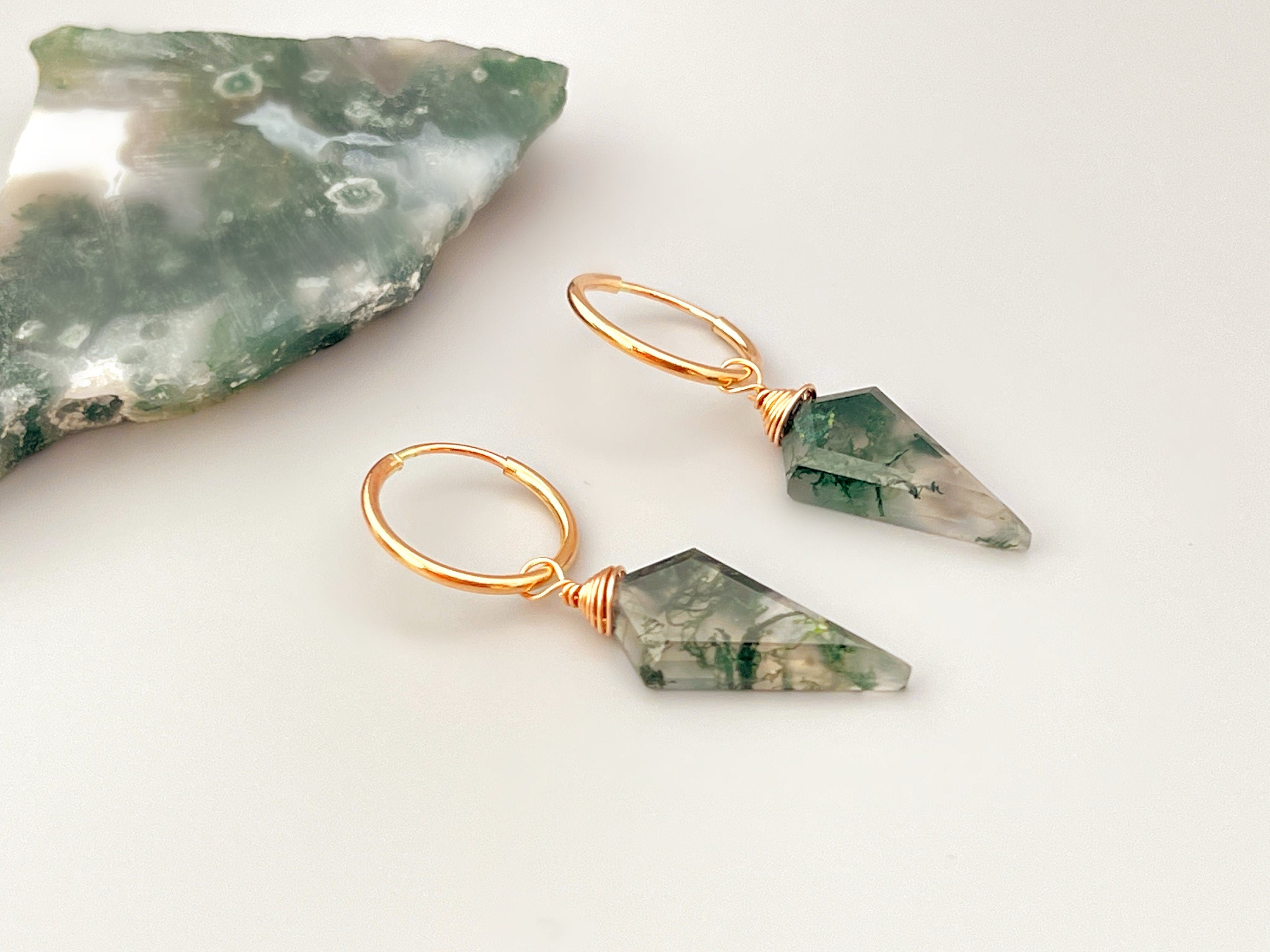 Moss Agate Hoop Earrings Dangle 14k Gold Fill Huggie Hoops