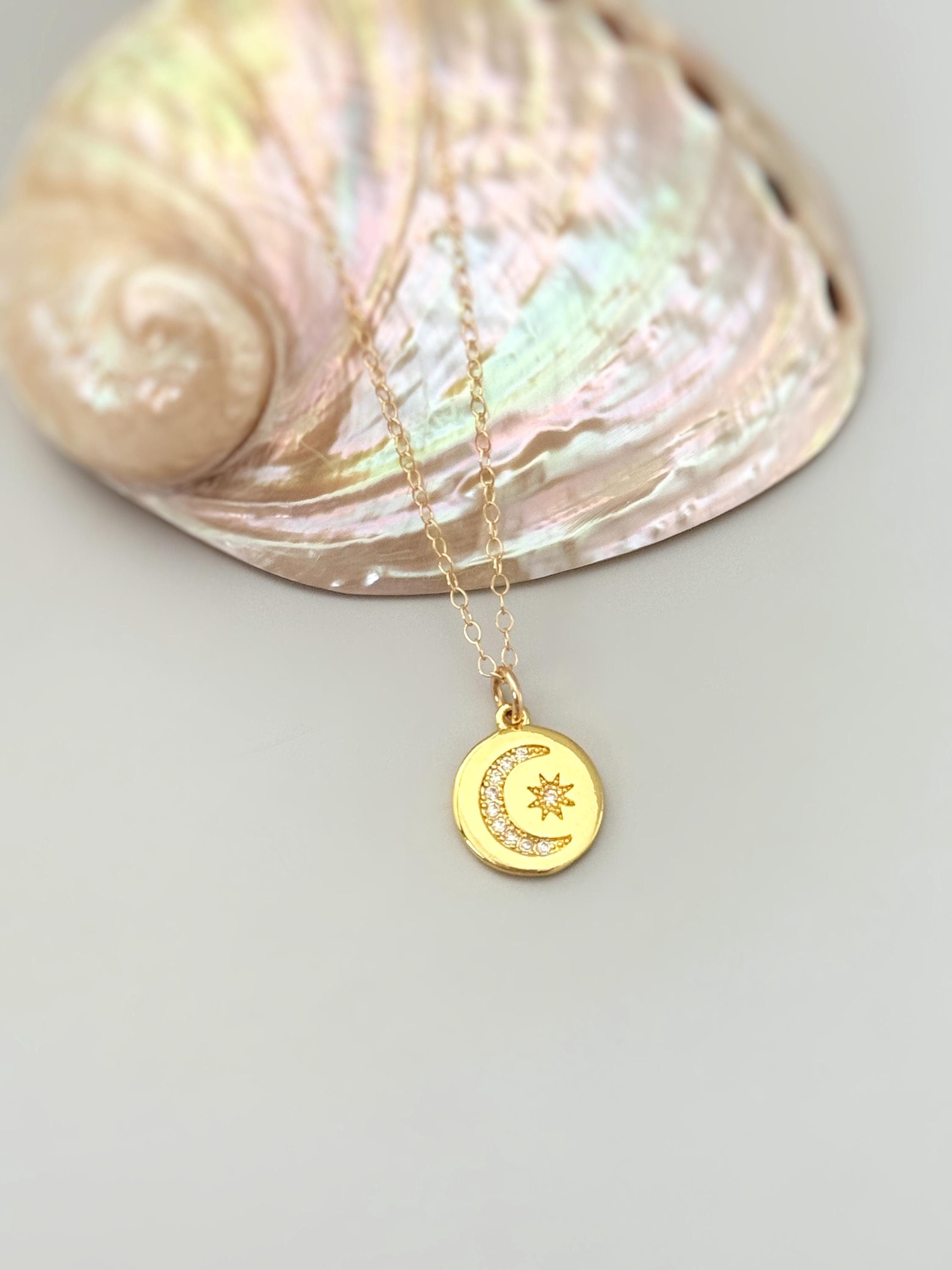 Handmade gold sparkling crystal celestial sun and moon necklace for women. 18k gold dipped pave set crystals crystals hang from a 14k gold filled chain