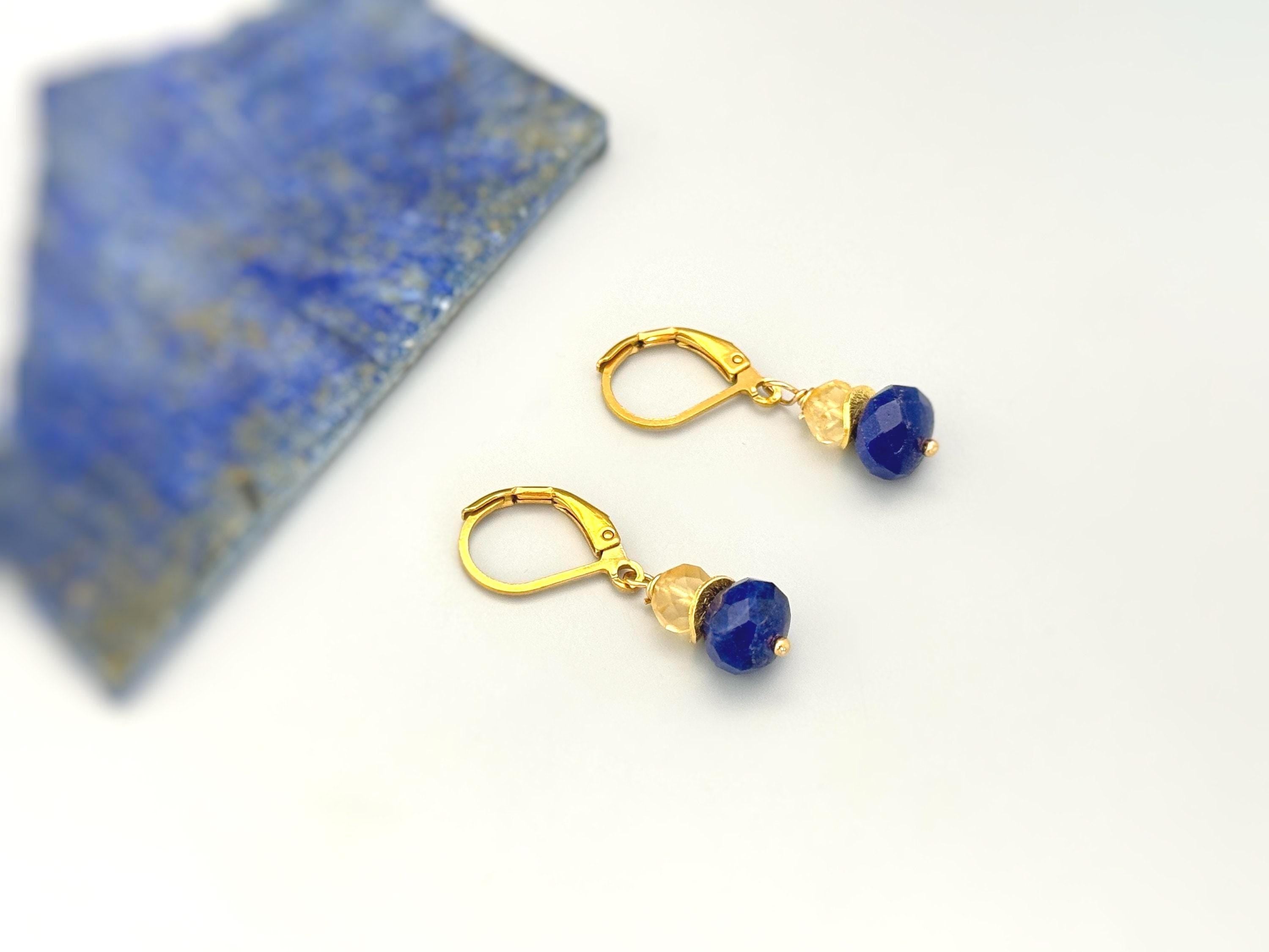 Dainty Lapis Lazuli and Citrine gemstone earrings in your choice of sterling silver, 14k gold Vermeil, or rose gold fill. Lovely deep blue lapis gemstones are paired with citrine and nested into your choice of 14k Gold Vermeil, Sterling Silver, or Rose gold and hang from matching leverbacks or Ear Wires.