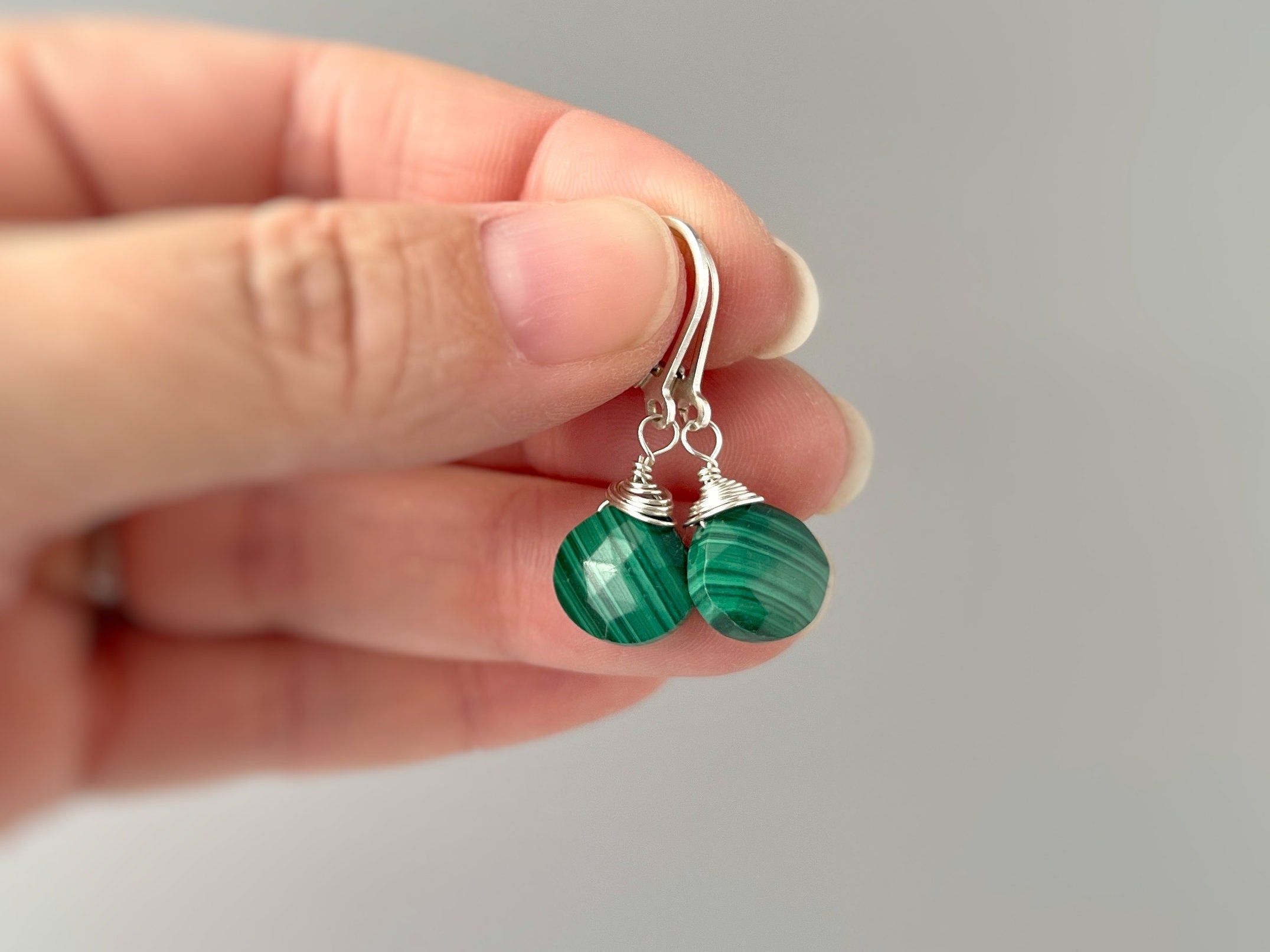Dainty handmade genuine Malachite Gemstone dangle earrings. Green gemstone earrings for women. Facetted green gemstone malachite tear drops hang from your choice of Sterling Silver, 14k gold Fill, or Rose Gold Fill French hook ear wires or leverbacks. Gemstone drops are dainty approx 1/4" wide. Simple, elegant everyday earrings. These would make a lovely gift for mom or wife with a March or April birthday. The matching necklace is available in our store.