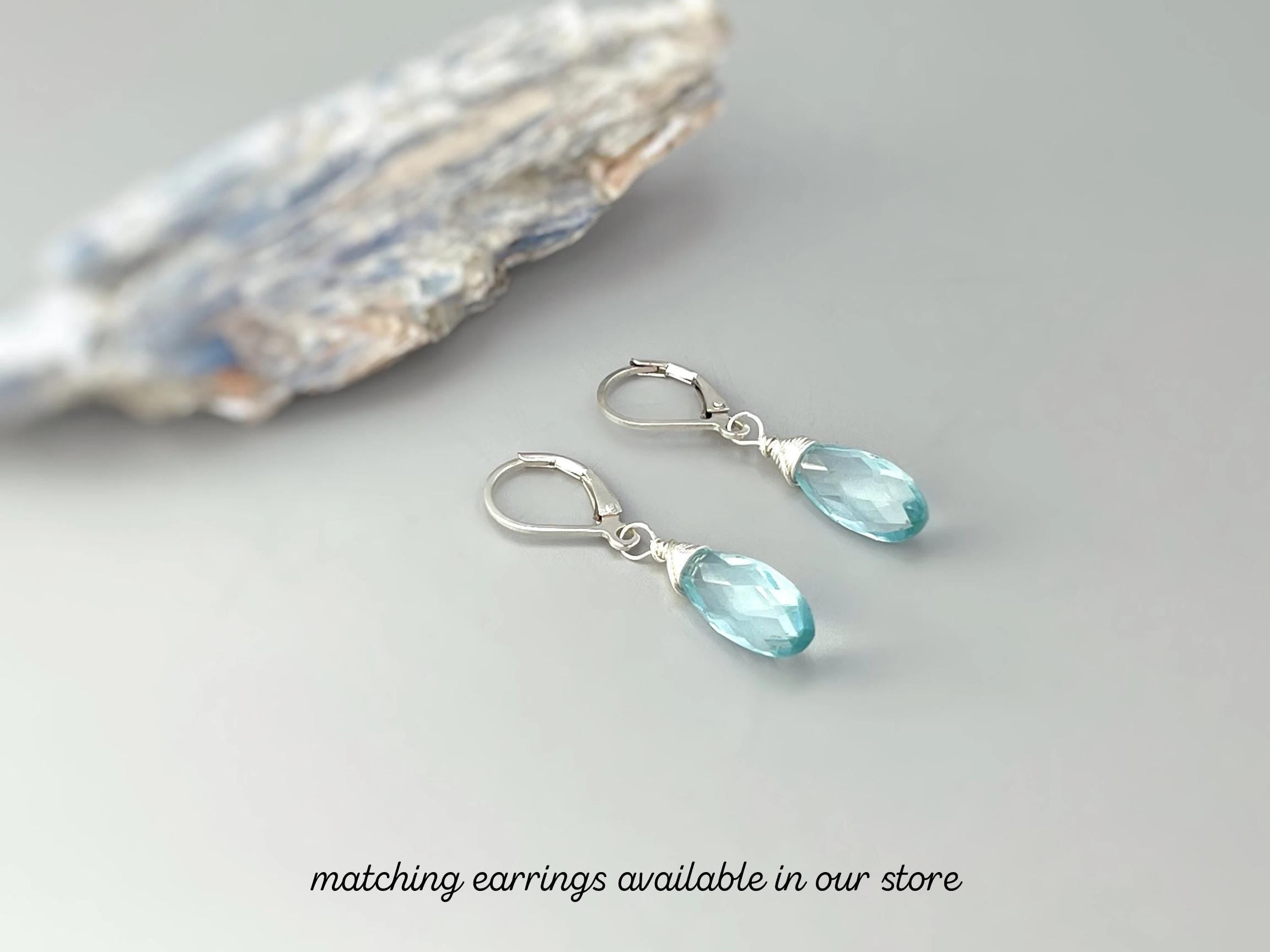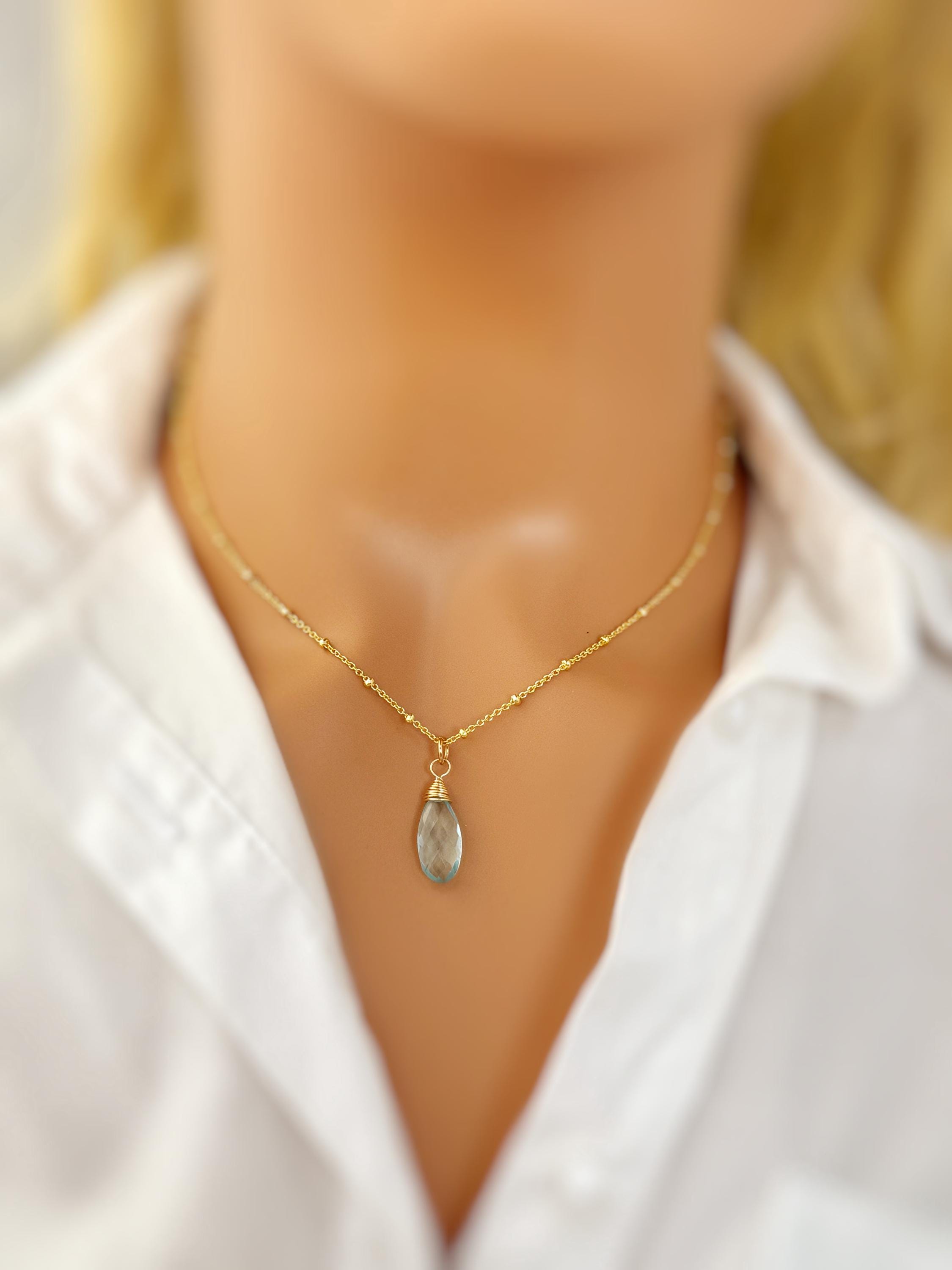 Handmade Aquamarine Quartz necklace. Dainty crystal necklace. A sparkling Aquamarine Quartz briolette is nestled in your choice of 14k gold fill, sterling silver, or rose gold fill on a matching chain. A simple, elegant handmade necklace perfect for everyday wear. The matching earrings are available in our store. A lovely gift for mom, wife, girlfriend or friend or bridesmaids.