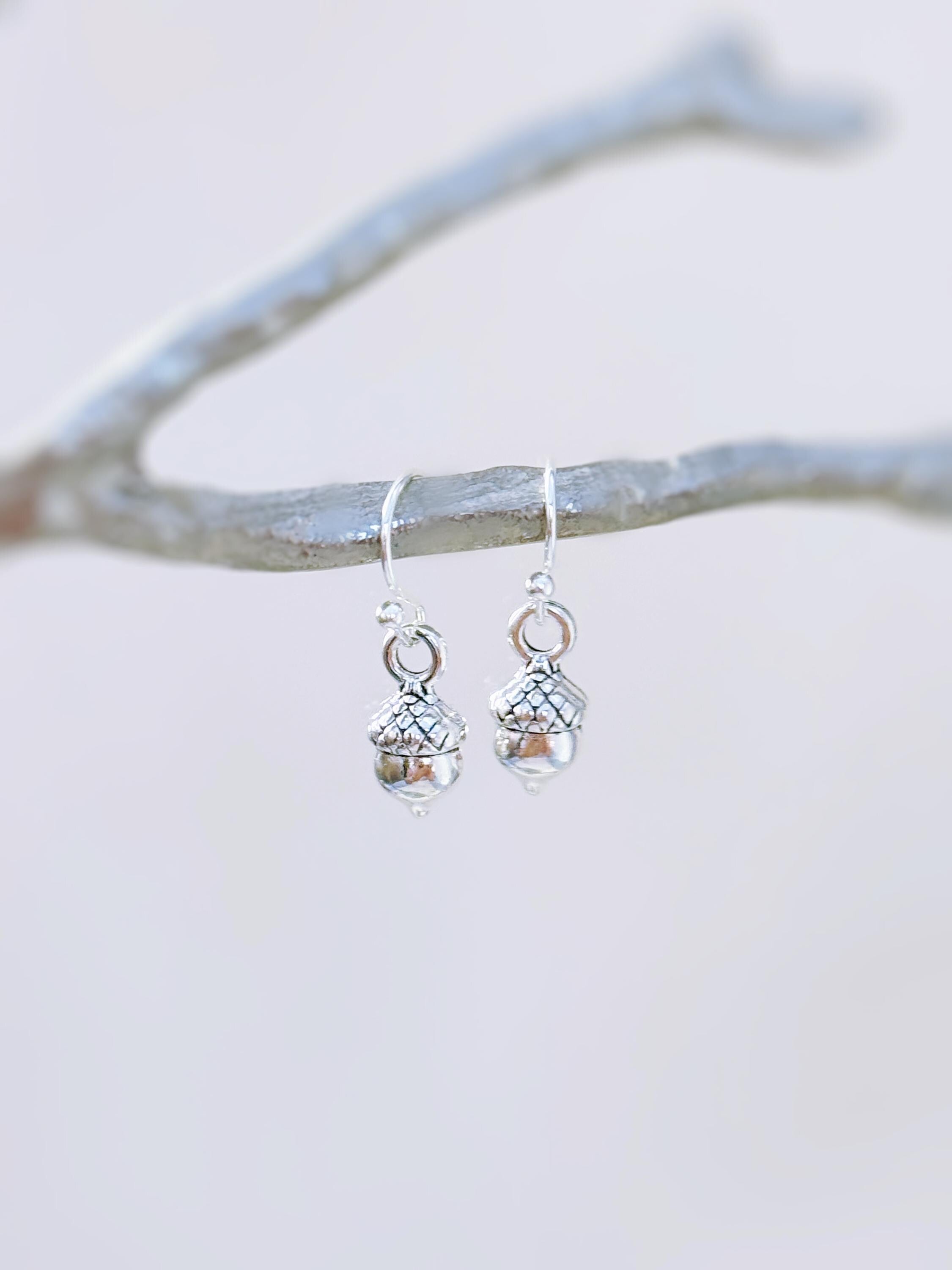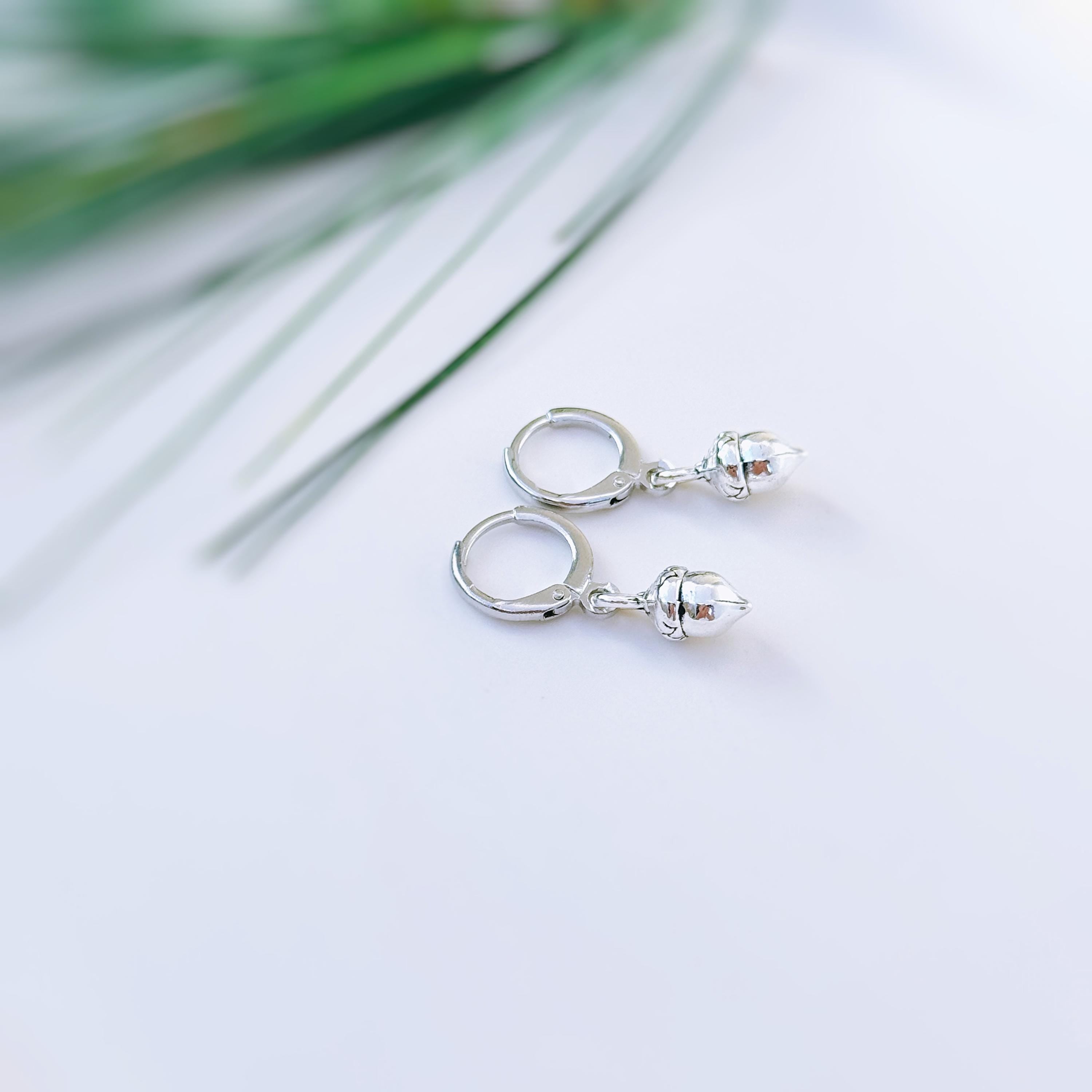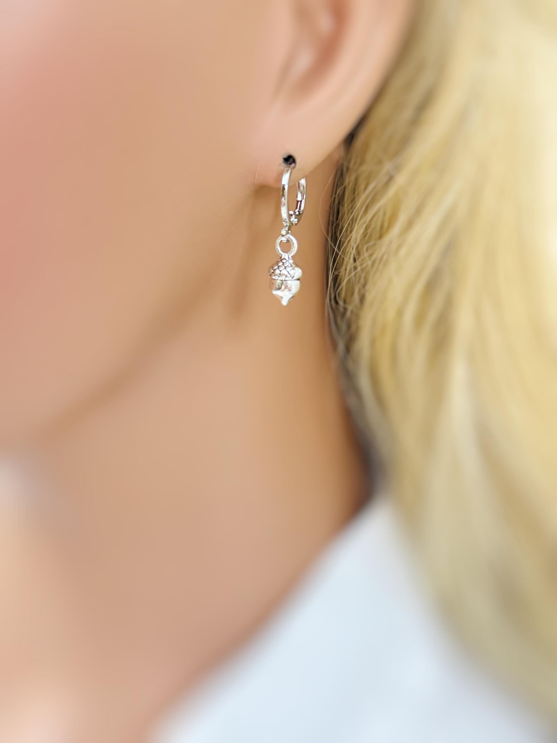 Silver Acorn Earrings  dangle Huggie Hoop handmade nature autumn fall jewelry for women earthy woodland gifts for sister roommate friend mom