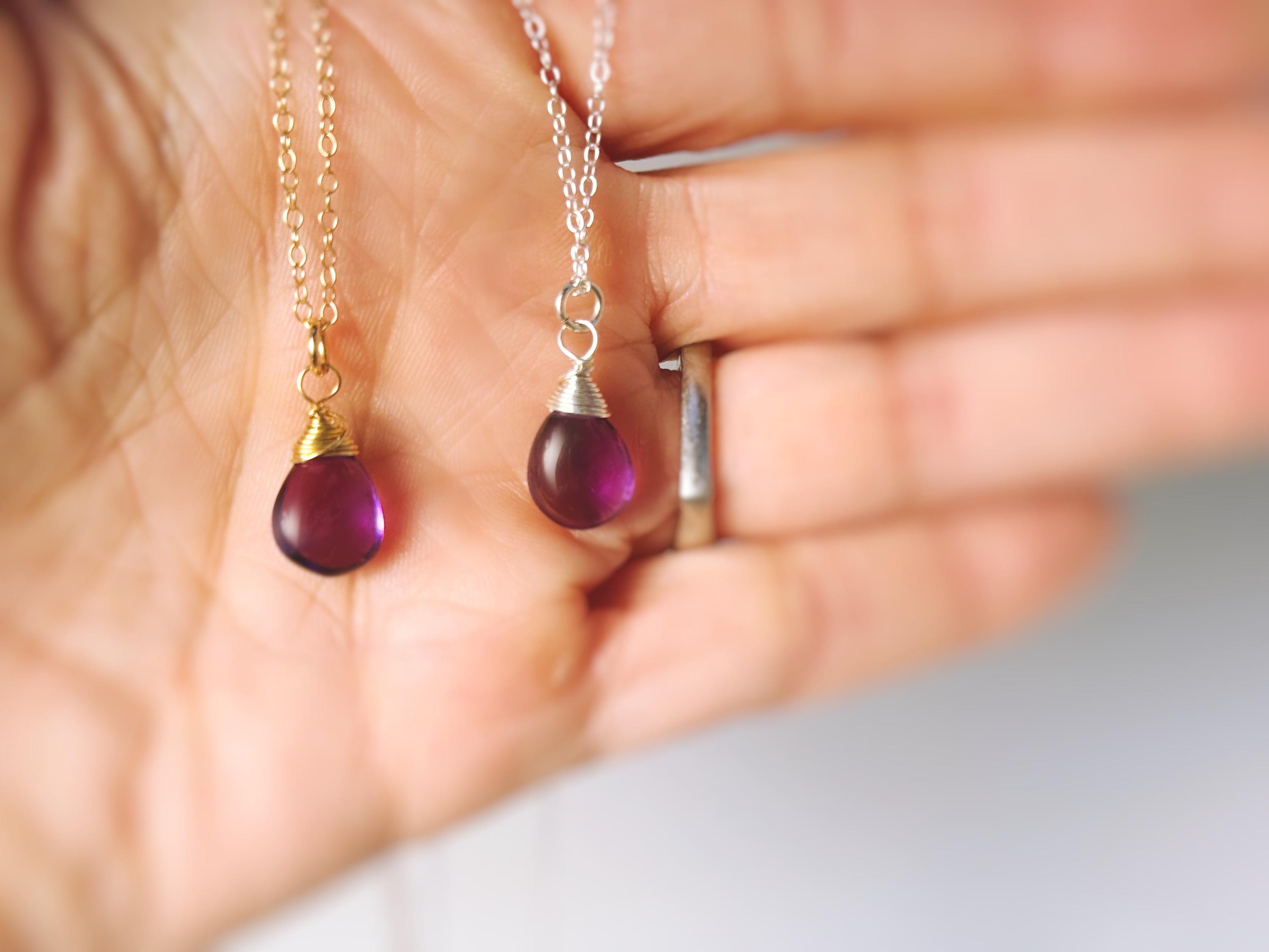 💜 Add a touch of timeless elegance to your look with this dainty amethyst necklace, featuring a smooth briolette-cut gemstone that catches the light beautifully. Each pendant is available in your choice of sterling silver or 14k gold fill. The pendant measures approximately 3/4" tall and 1/4" wide, making it the perfect everyday necklace for layering or wearing solo. This minimalist design can be purchased as a complete necklace or as a pendant alone to complement your favorite chain.