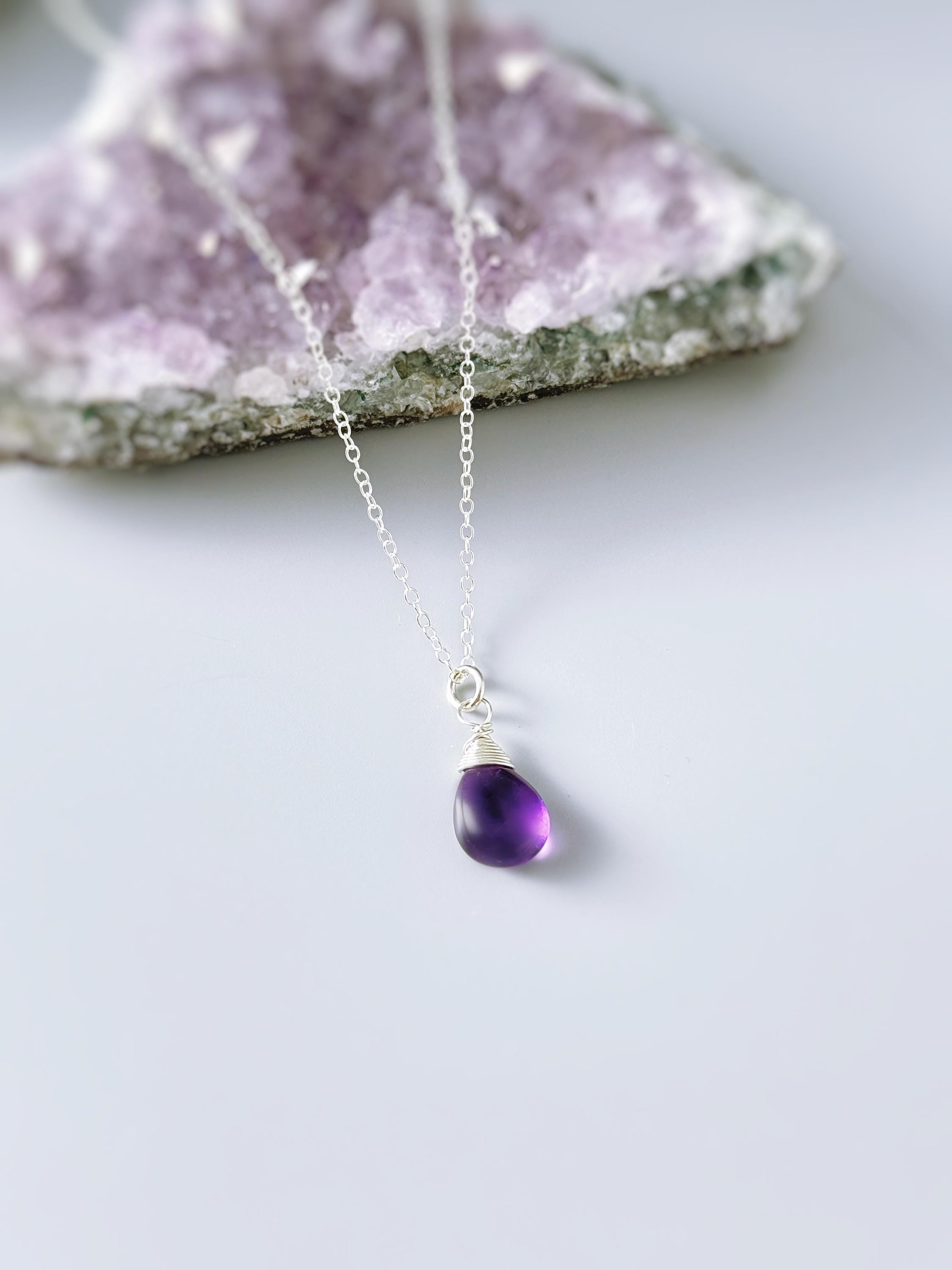 Dainty Silver Amethyst Necklace Smooth Briolette Purple Gemstone Pendant Sterling Silver or 14k Gold Fill February Birthstone Jewelry gift