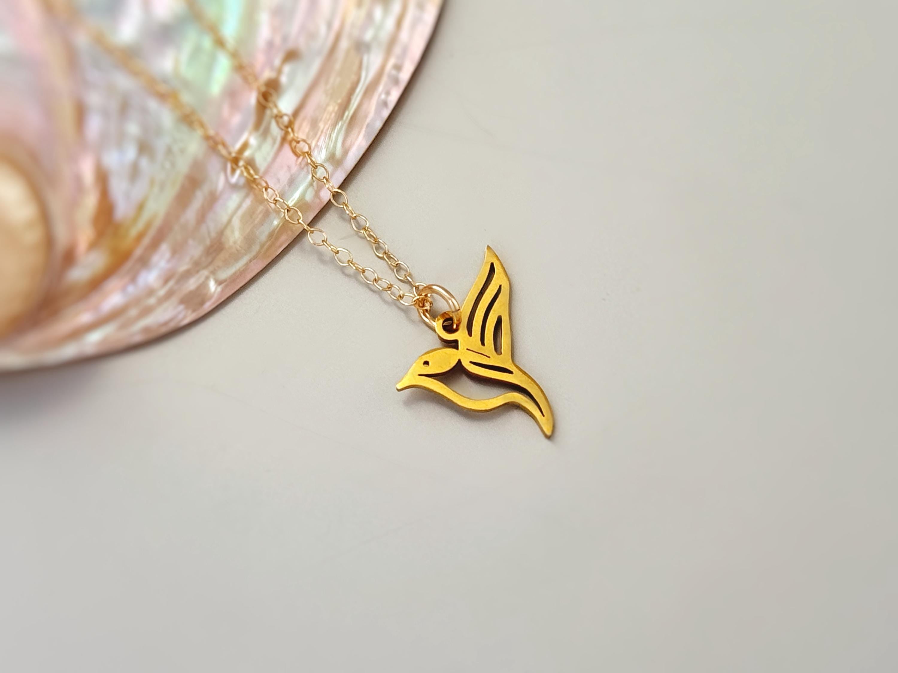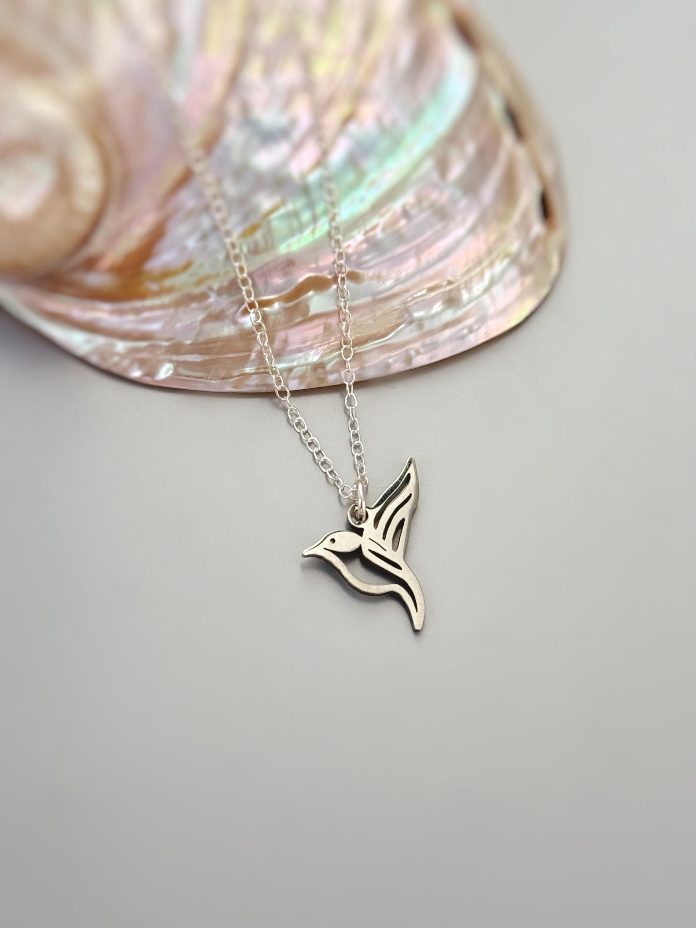 Handmade hummingbird necklace for women. A silver or gold hummingbird hangs from a matching sterling silver or 14k gold fill chain. A fun, unique pendant necklace perfect for everyday wear. The matching earrings are available in our store. Minimalist modern hummingbird jewelry for women. A great gift for bird and nature lovers, moms, sisters, friends and wives