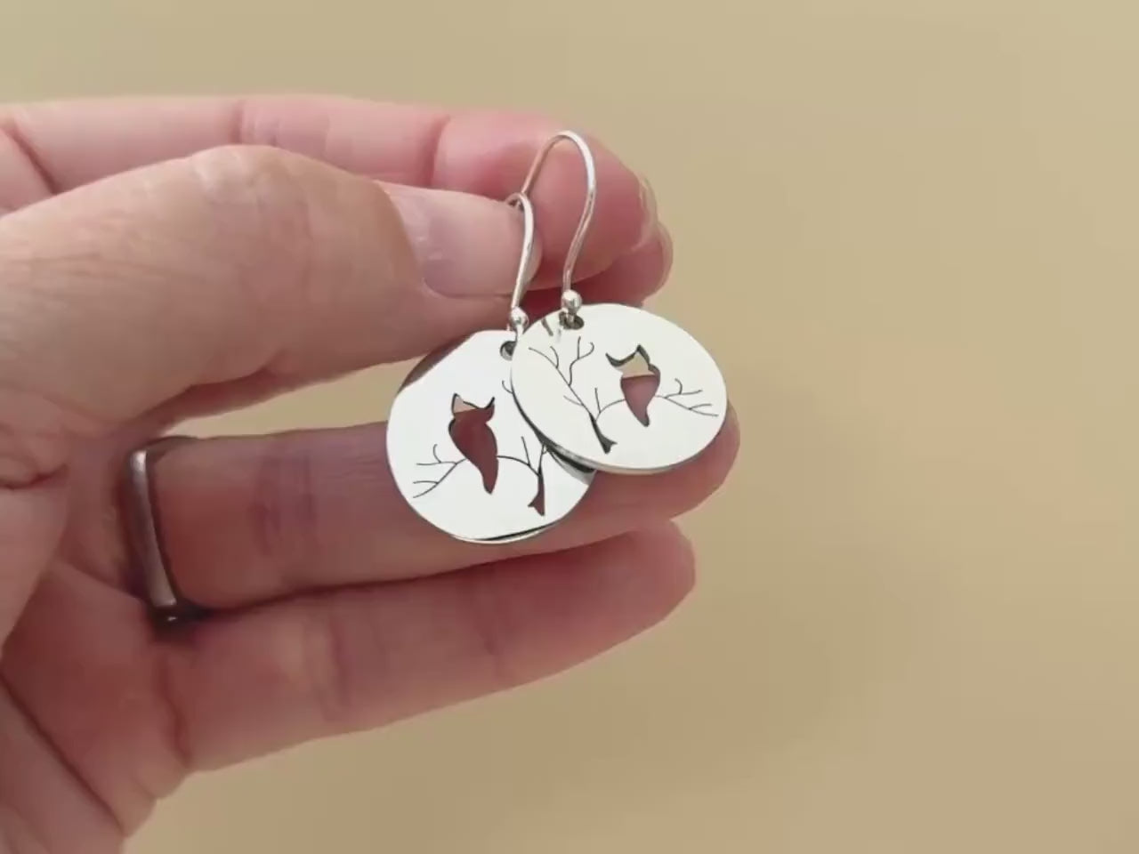 Handmade Owl Dangle earrings. These fun witchy owl earrings are the perfect gift for bird lovers. Silver owl discs hang from your choice of 925 Sterling Silver, or Silver plated ear wires or kidney wire earring backs.