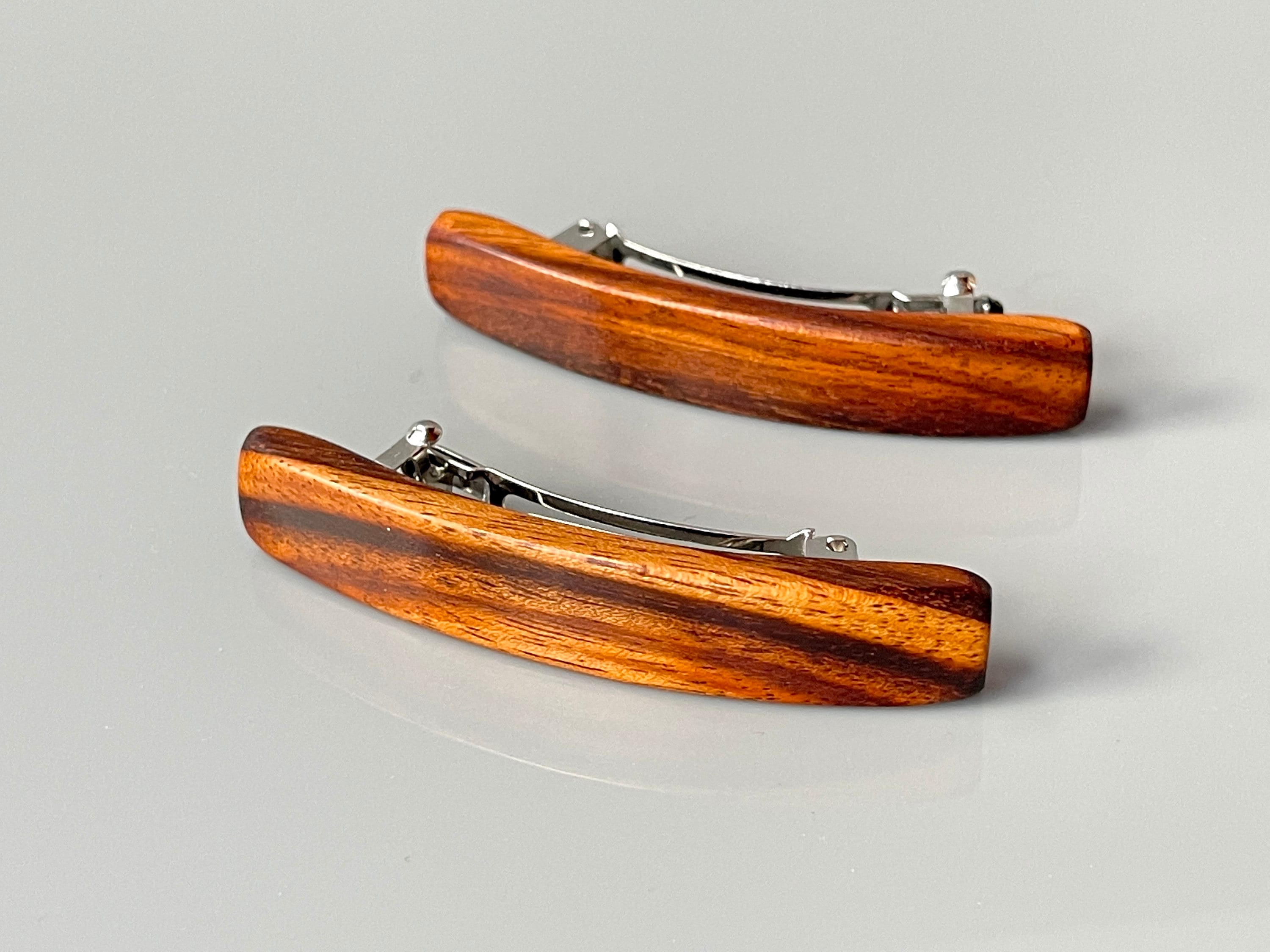 Handcrafted wood barrettes in Tigerwood