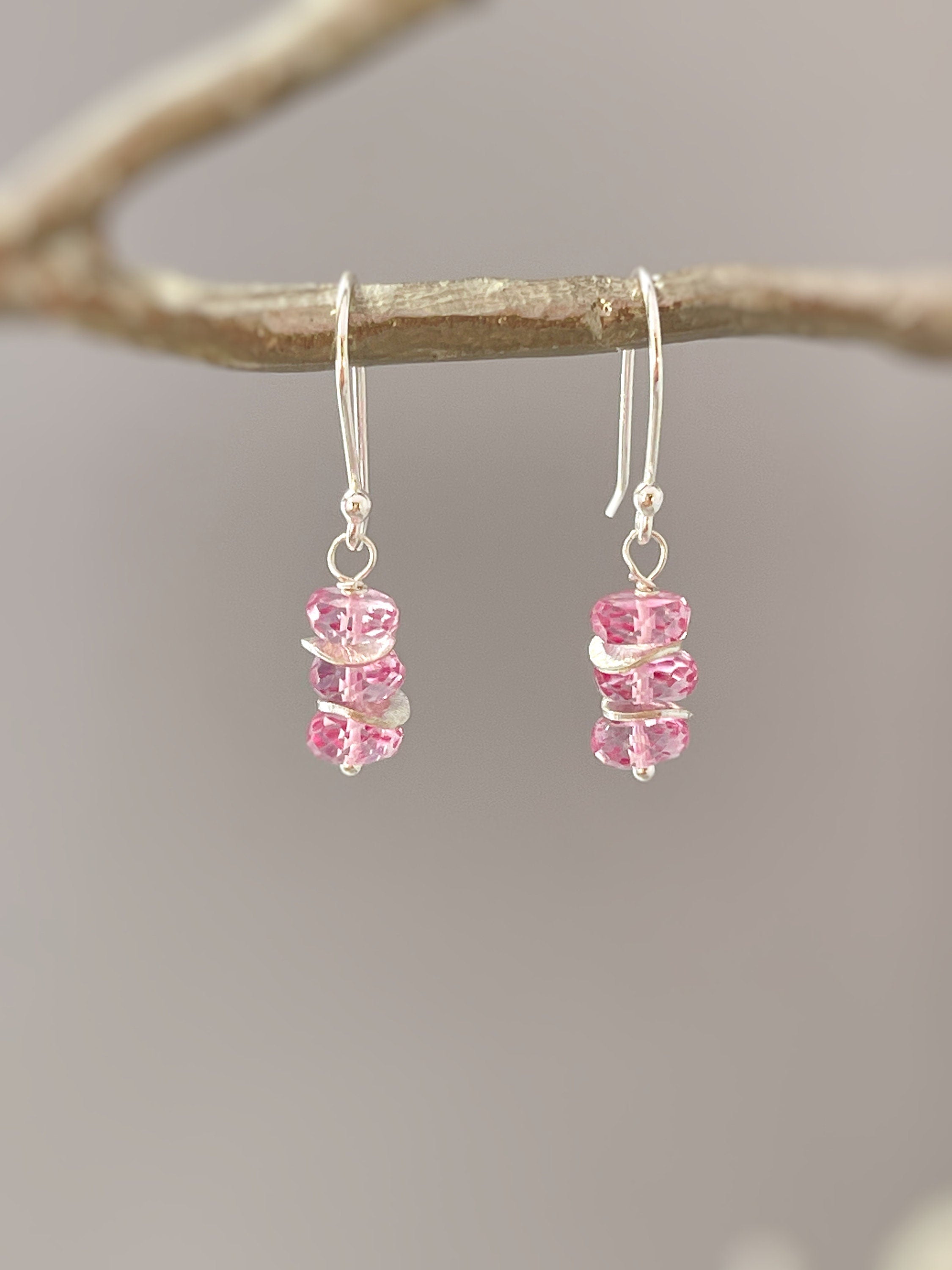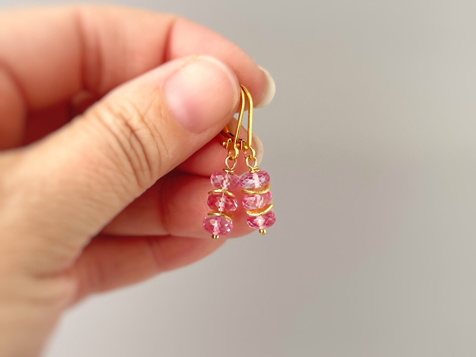 Dainty handmade genuine Pink Topaz dangle earrings for women. Lightweight everyday feminine earrings. Sparkling pink topaz gemstone rondelles hang from your choice of Sterling Silver, 14k Gold Fill, or Rose Gold Fill French hook ear wires or leverbacks. Gemstone drops are dainty just under 1/4" wide. Simple, elegant everyday earrings. These would make a lovely gift for mom or wives with a November birthday also lovely bridesmaids gifts.