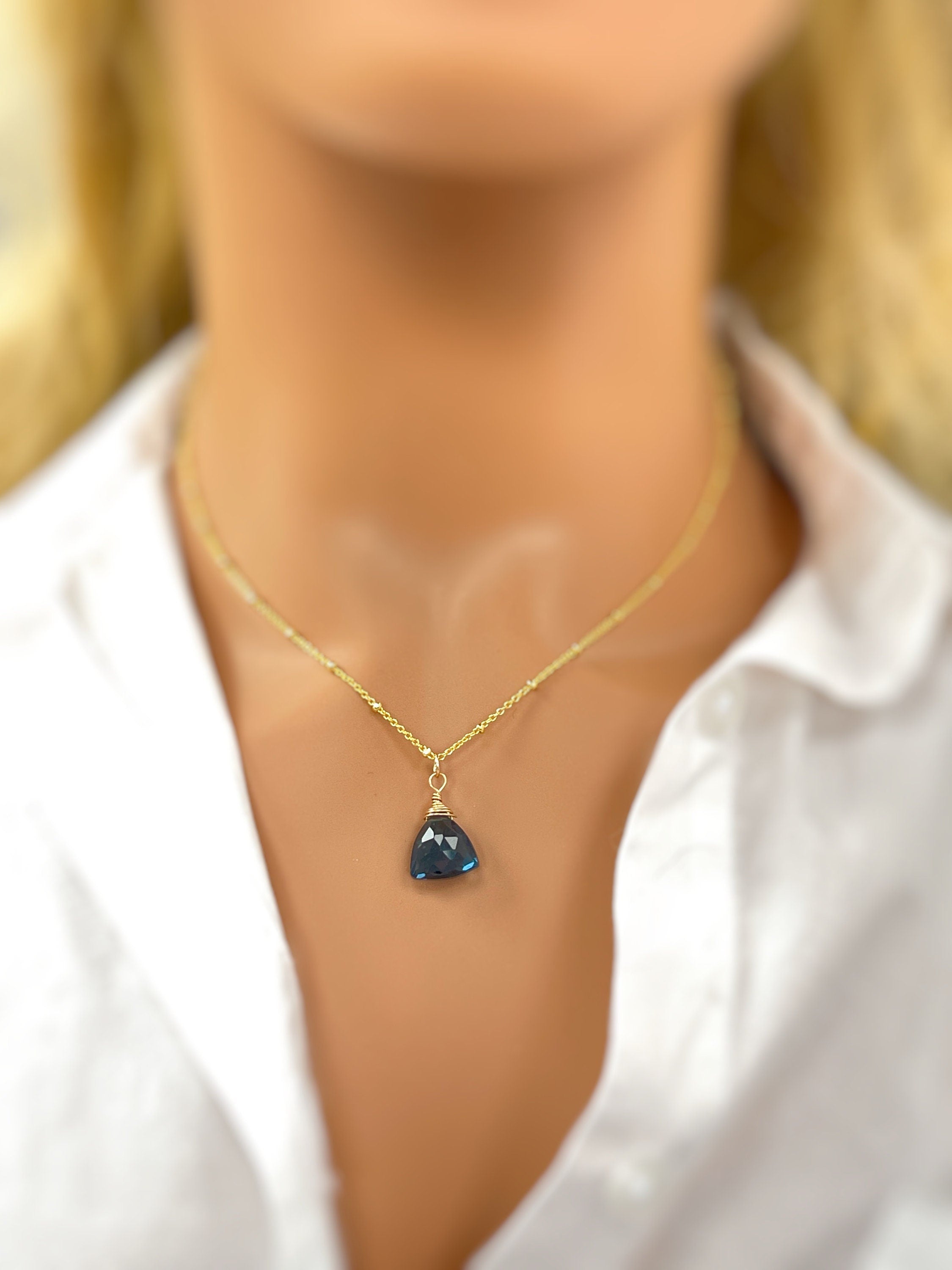 Handmade London Blue Quartz necklace. Dainty solitaire necklace. A sparkling London Blue Quartz briolette nestled in your choice of 14k gold fill, sterling silver, or rose gold fill on a matching chain. A simple, elegant handmade necklace perfect for everyday wear. The matching earrings are available in our store. A lovely gift for a wife wife, girlfriend or mom or bridesmaids.