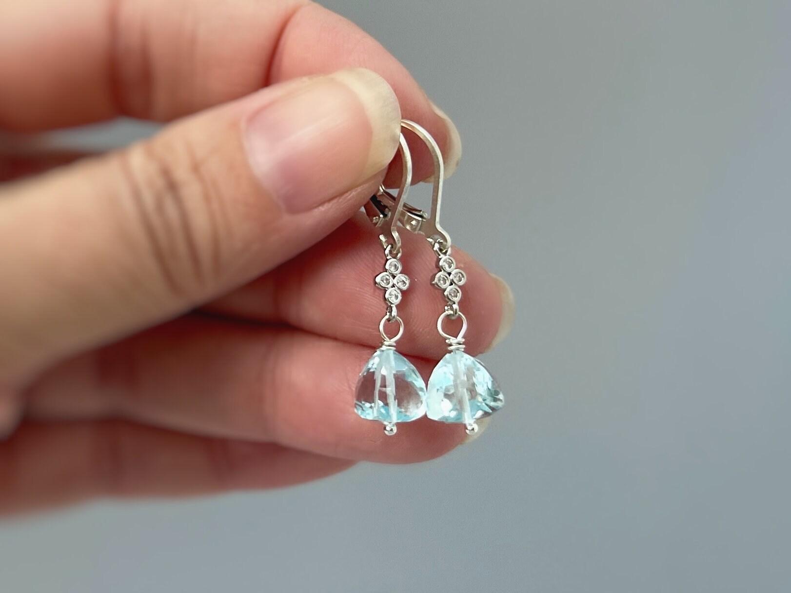 Handmade Sky blue quartz  dangly earrings for women. Sparkling sky blue quartz drops in a unique facetted cut are paired with sparkling pave set crystals are wrapped in your choice of Sterling Silver , rose gold or 14k gold fill and hang from matching leverbacks (pictured) or French Hook Ear Wires. Lovely lightweight earrings. These would make a wonderful gift for a wife or girlfriend with a November birthday.