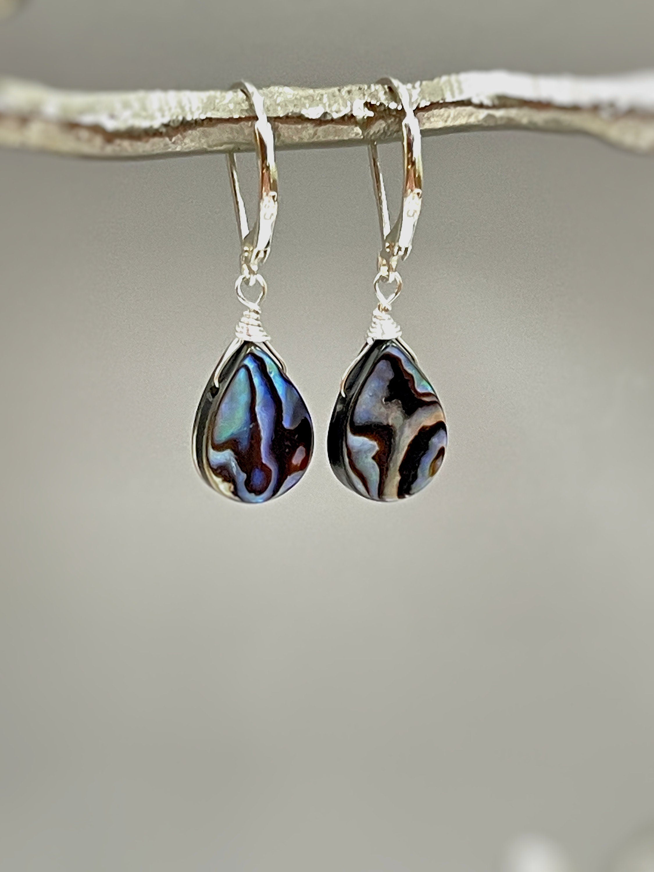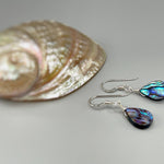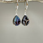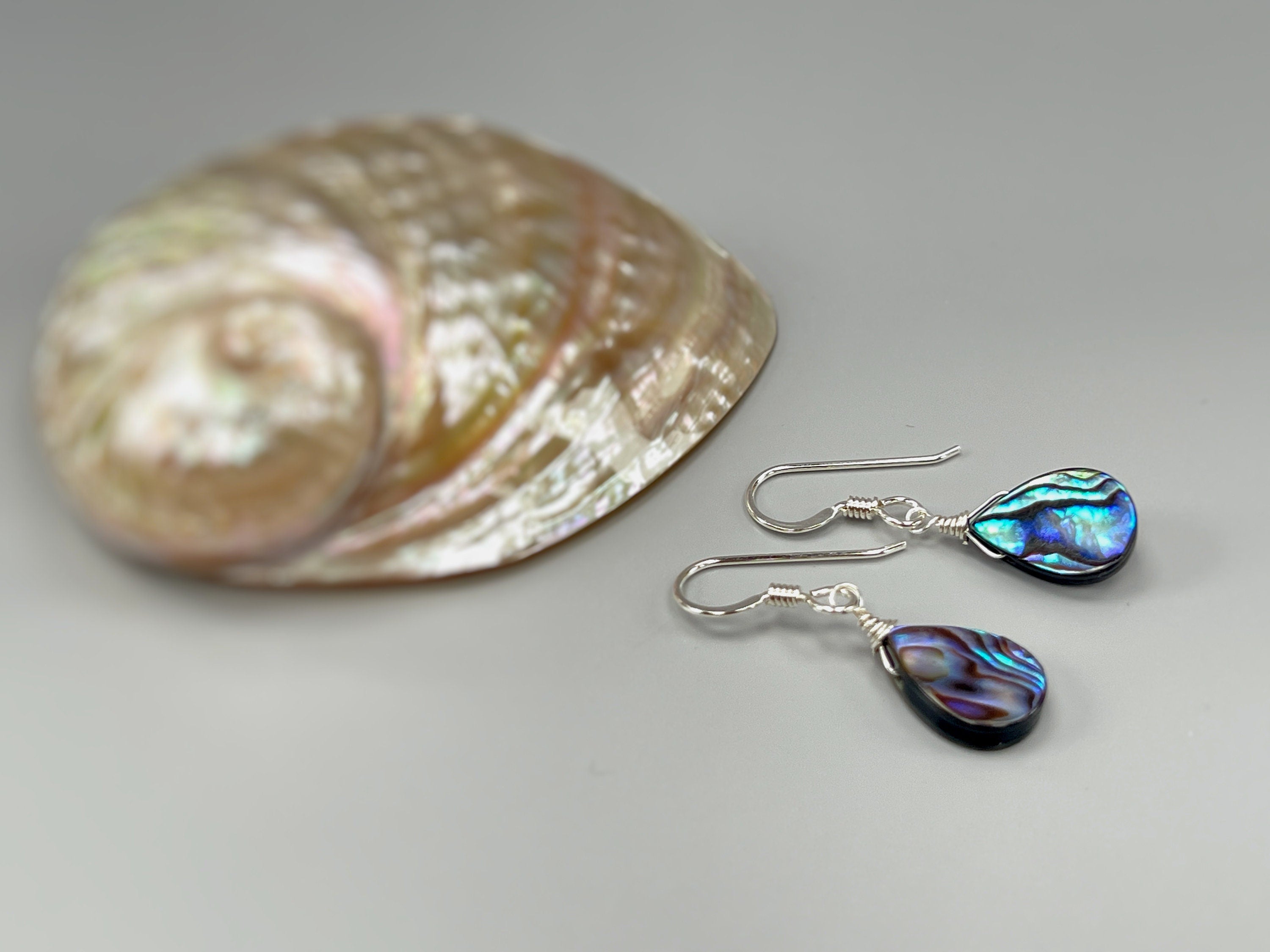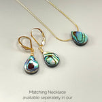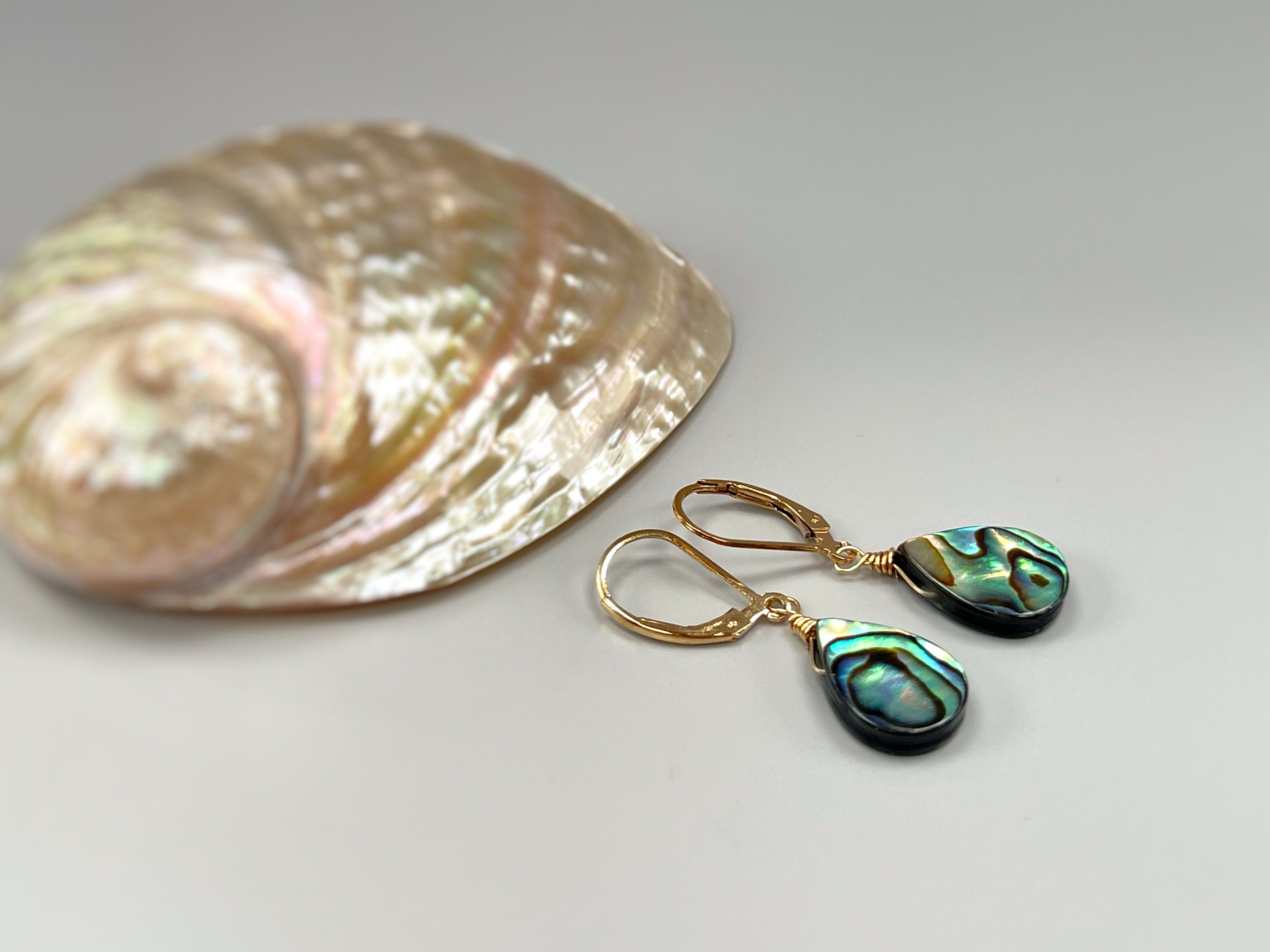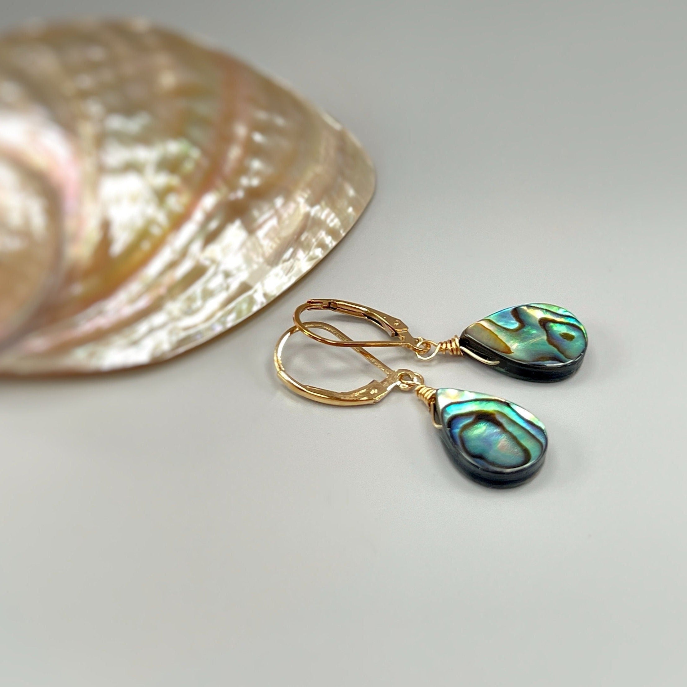 Handmade Abalone Dangle Earrings. Iridescent abalone shell tear drops are set in your choice of 14k gold fill, sterling silver or solid 14k gold and hang from your choice of leverbacks or French hook ear wires. Abalone drops are approx 14x10mm (about 5/8" long). Simple, elegant earrings perfect summer or beach wedding earrings. The matching necklace is available for purchase separately in our store.