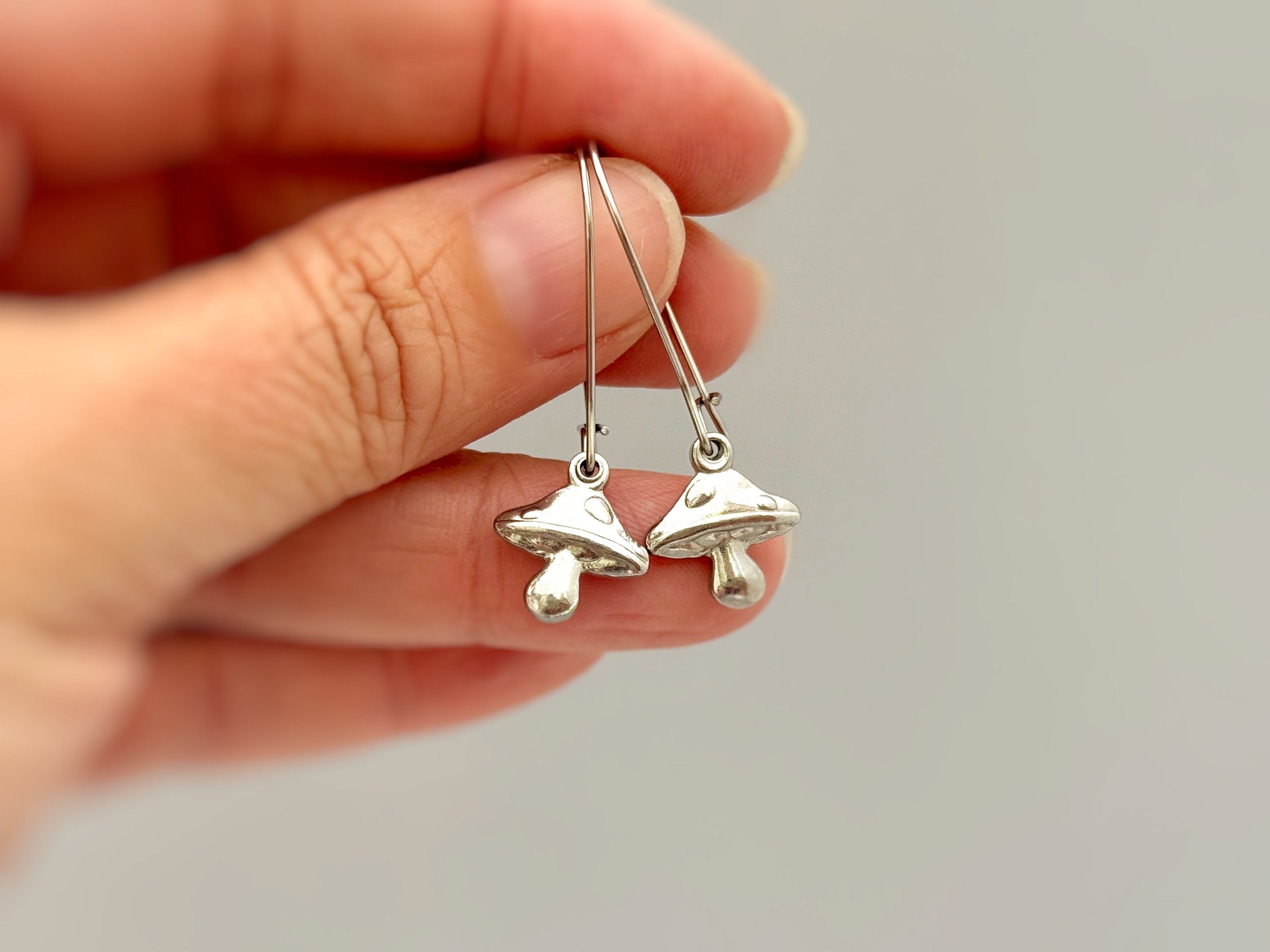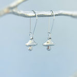 Handmade Mushroom Dangle earrings. These fun mushroom earrings are the perfect gift for moms, nature and plant lovers. Gold or silver mushrooms hang from your choice of Sterling Silver, Gold plated or Silver plated kidney wire earrings.