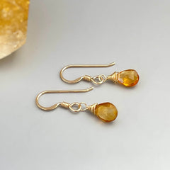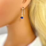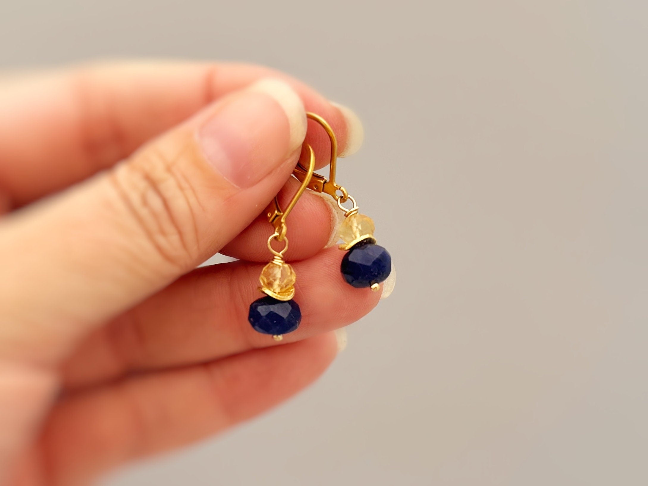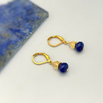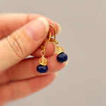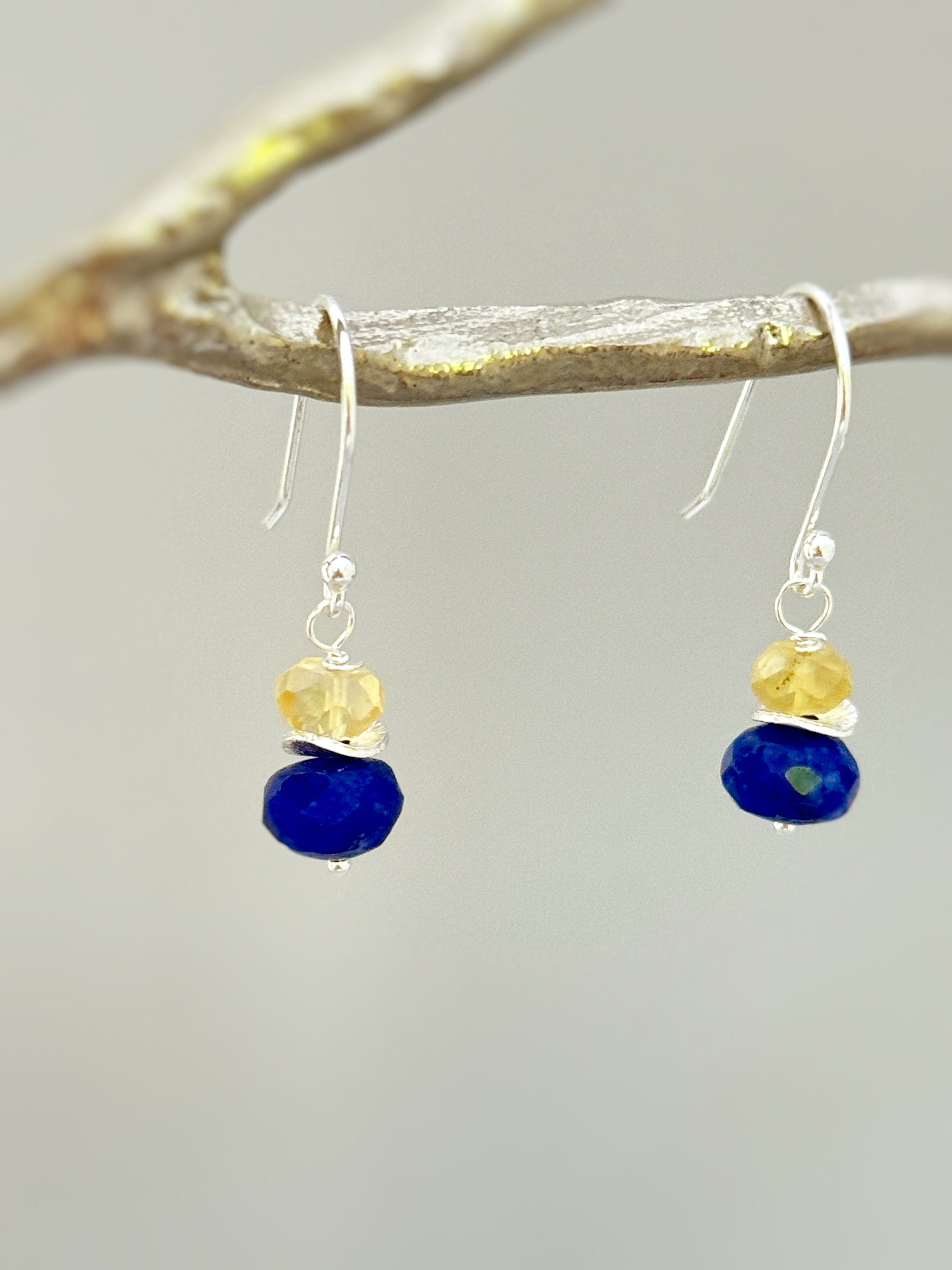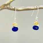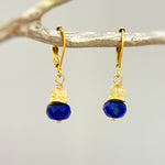 Dainty Lapis Lazuli and Citrine gemstone earrings in your choice of sterling silver, 14k gold Vermeil, or rose gold fill. Lovely deep blue lapis gemstones are paired with citrine and nested into your choice of 14k Gold Vermeil, Sterling Silver, or Rose gold and hang from matching leverbacks or Ear Wires.
