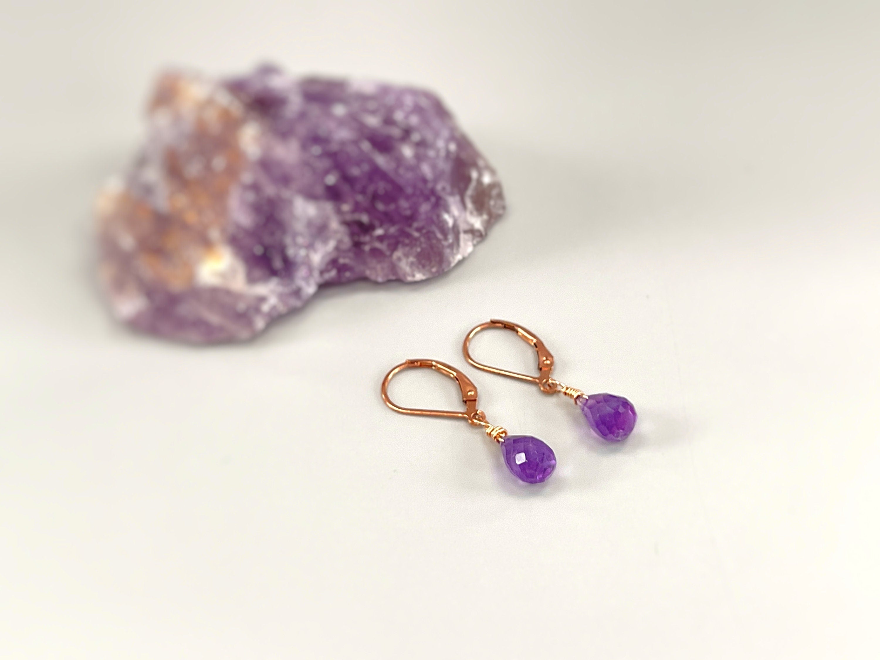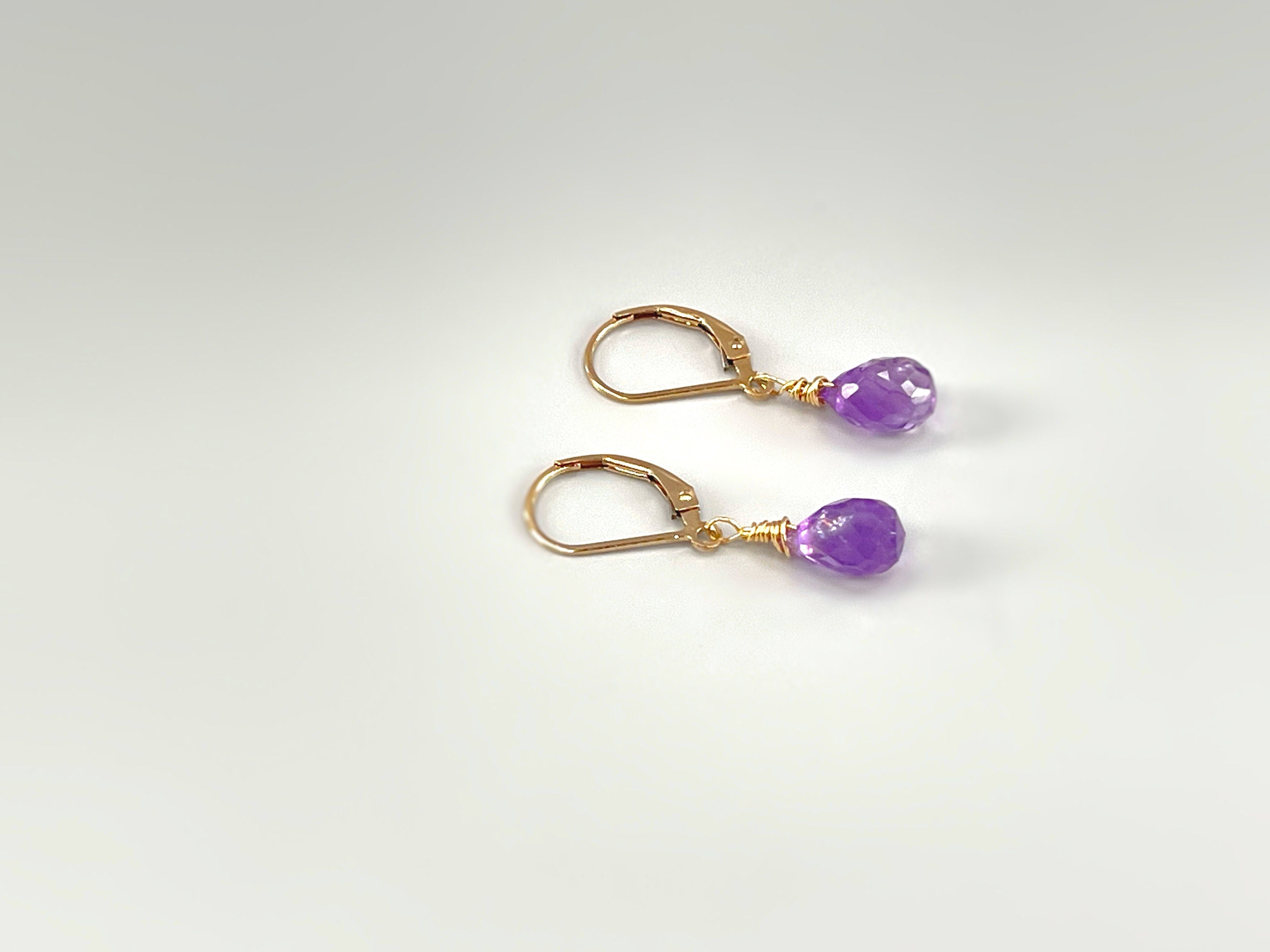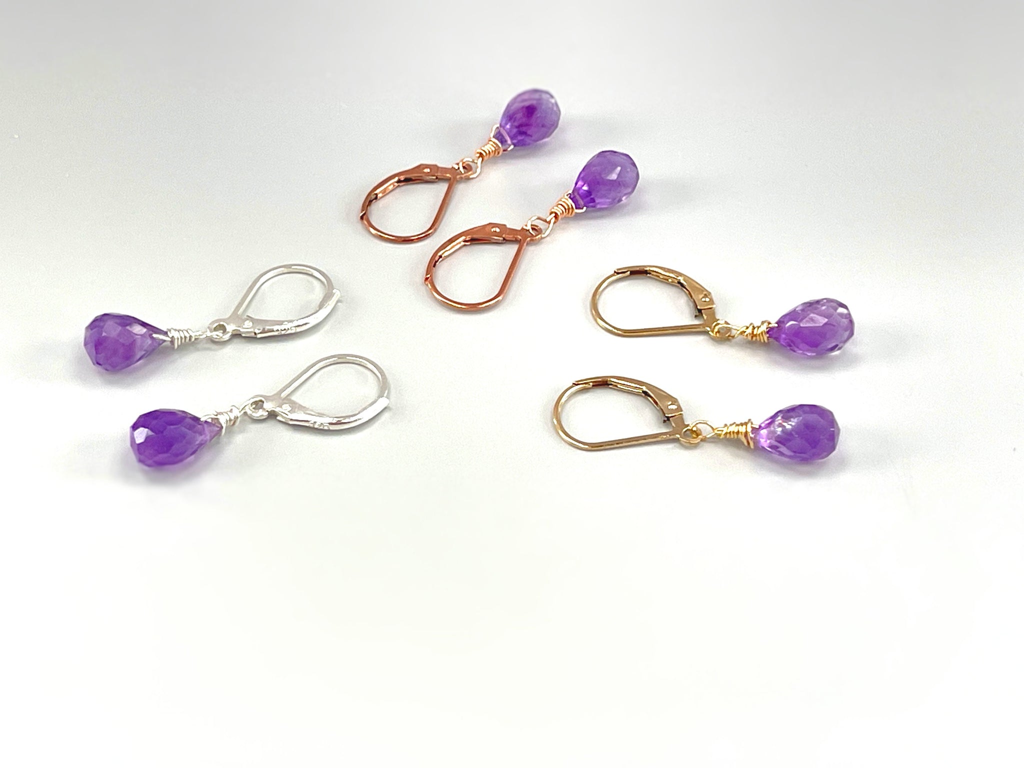 Dainty facetted genuine amethyst tear drops are set in your choice of sterling silver, 14k gold fill, Rose Gold Fill or solid 14k gold and hang from matching Leverback ear wires. Simple, elegant earrings.