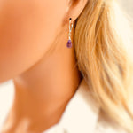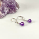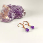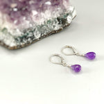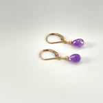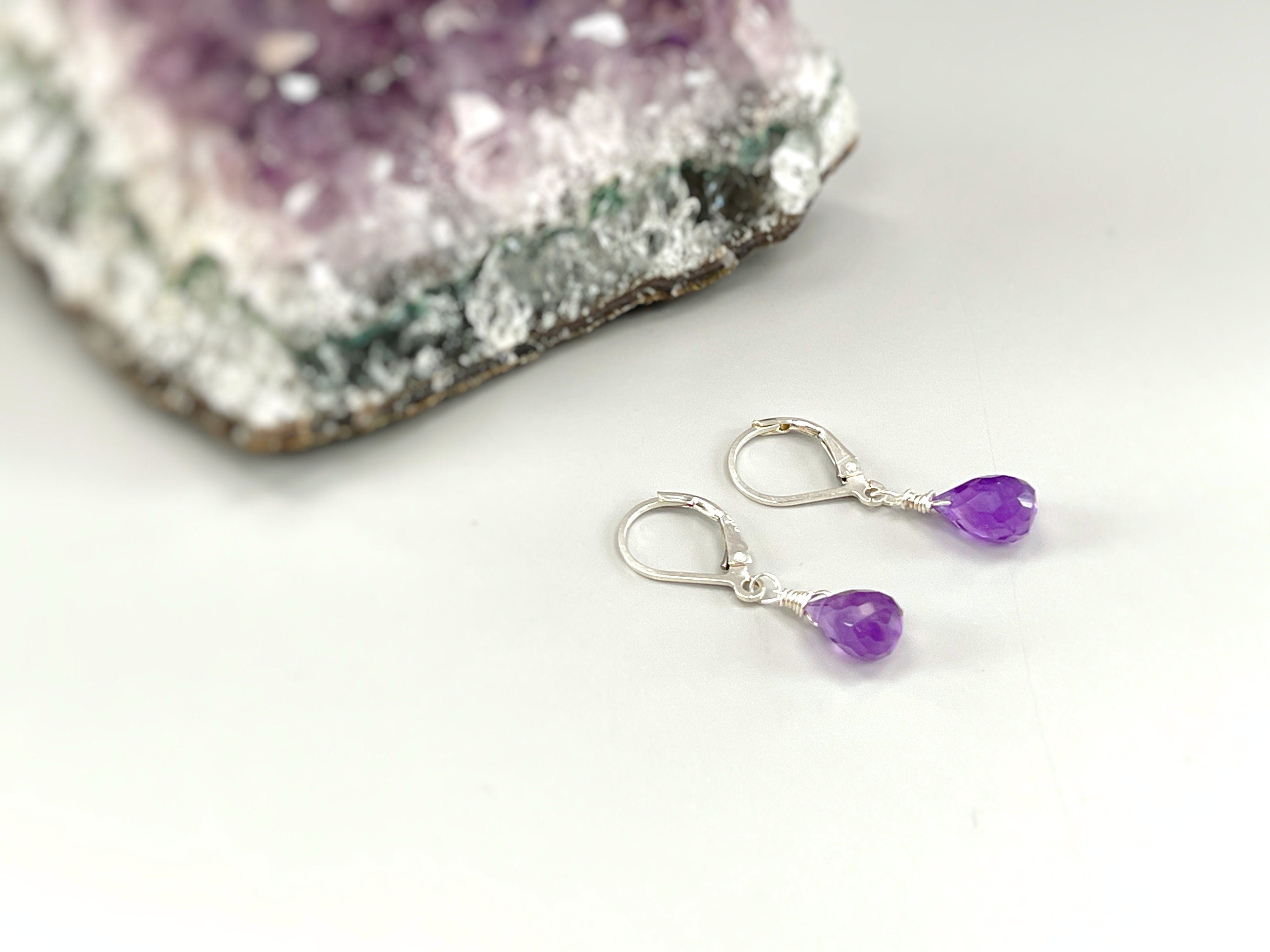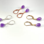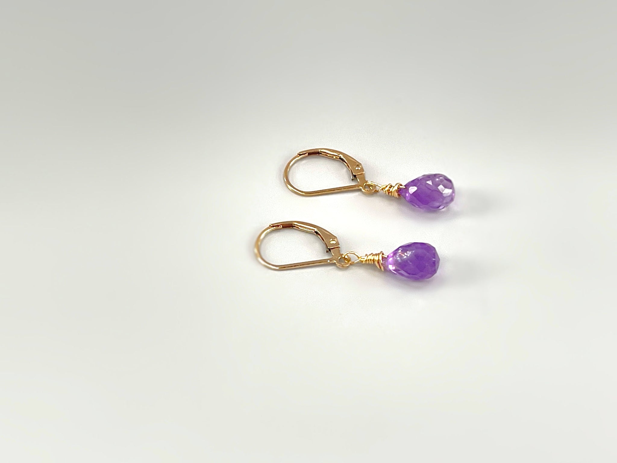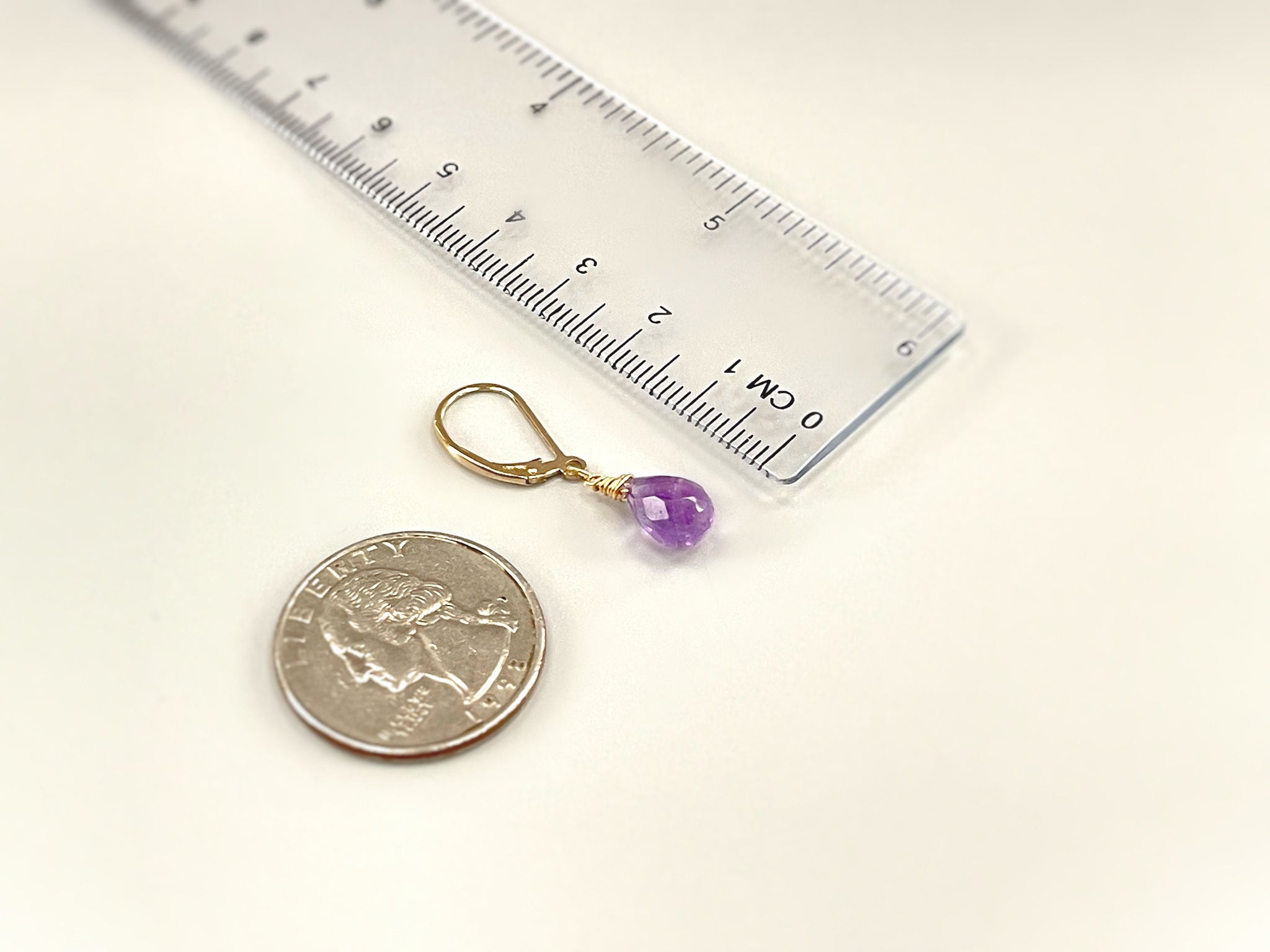 Dainty facetted genuine amethyst tear drops are set in your choice of sterling silver, 14k gold fill, Rose Gold Fill or solid 14k gold and hang from matching Leverback ear wires. Simple, elegant earrings.