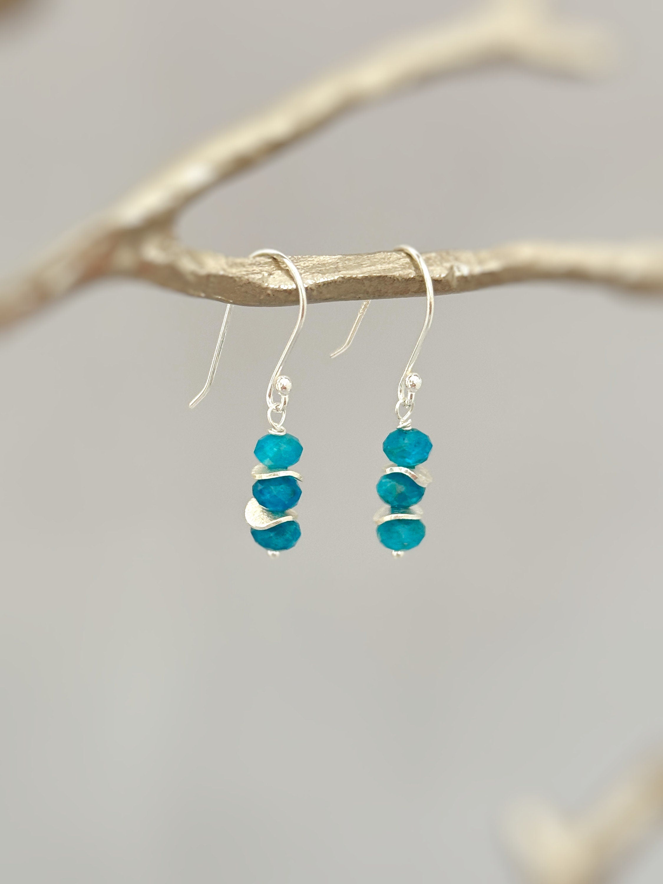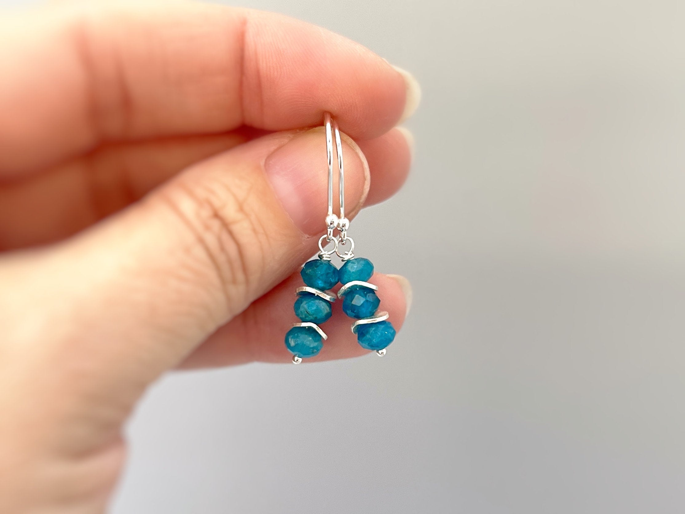 Dainty handmade genuine blue apatite dangle earrings for women. Lightweight everyday blue gemstone earrings. Facetted blue apatite gemstone rondelles hang from your choice of Sterling Silver, 14k Gold Fill, or Rose Gold Fill French hook ear wires or leverbacks. Gemstone drops are dainty just under 1/4" wide. Simple, elegant everyday earrings. These would make a lovely gift for mom, wives, bridesmaids gifts.