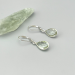 Handmade Green Amethyst Dangle Earrings for women. Facetted genuine pale mint, sage Green Amethyst (also called Prasiolite) gemstone drops are set sterling silver and hang from matching leverbacks. Simple, lightweight elegant earrings.
