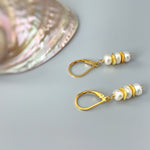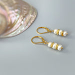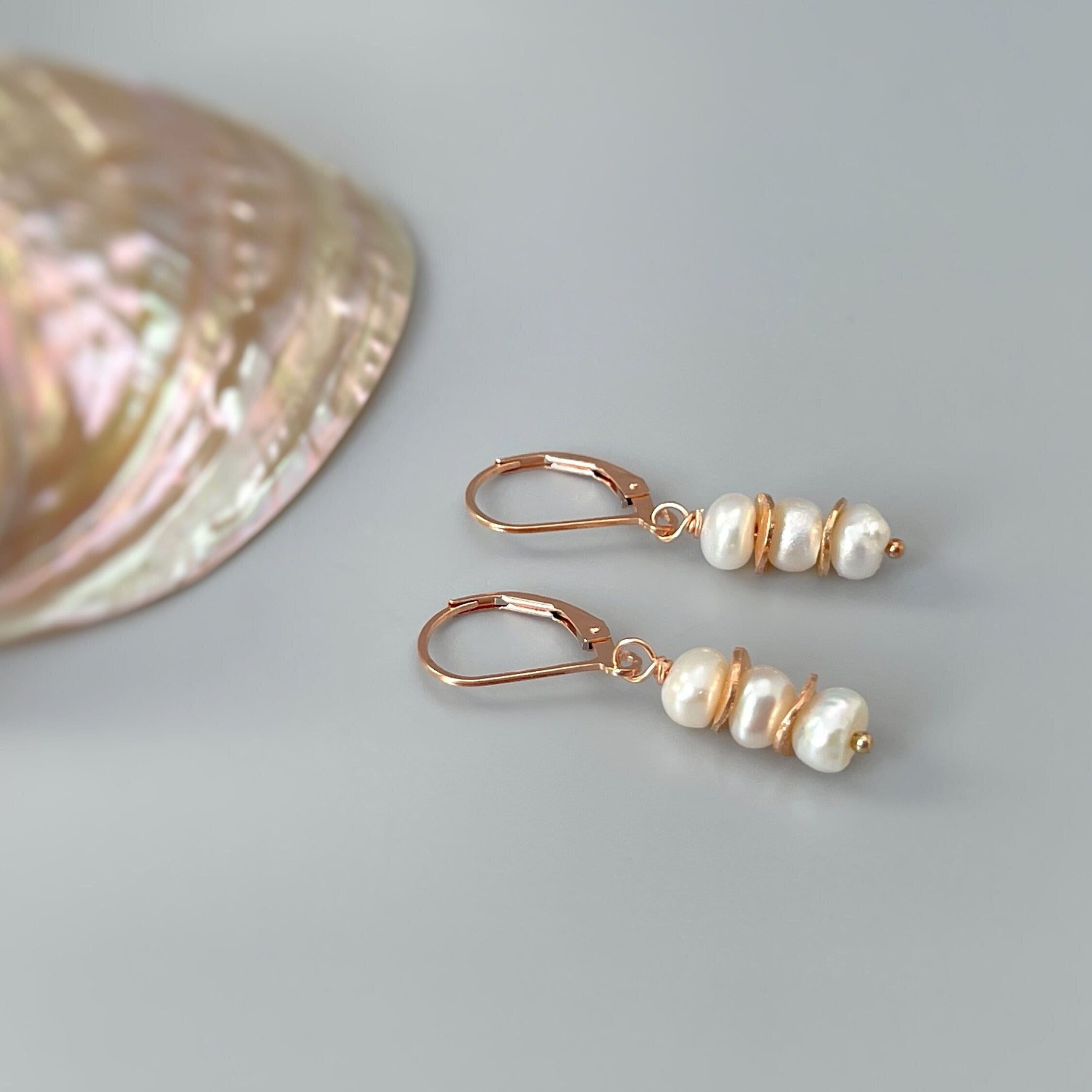 Handmade Dainty Pearl Drop earrings for women. Lovely white freshwater pearls hang from your choice of hand crafted sterling silver, rose gold, or 14k gold fill ear wires or leverbacks. Dainty, lightweight, simple, minimalist everyday earrings for women, brides and bridesmaids. Perfect for a June Birthday.