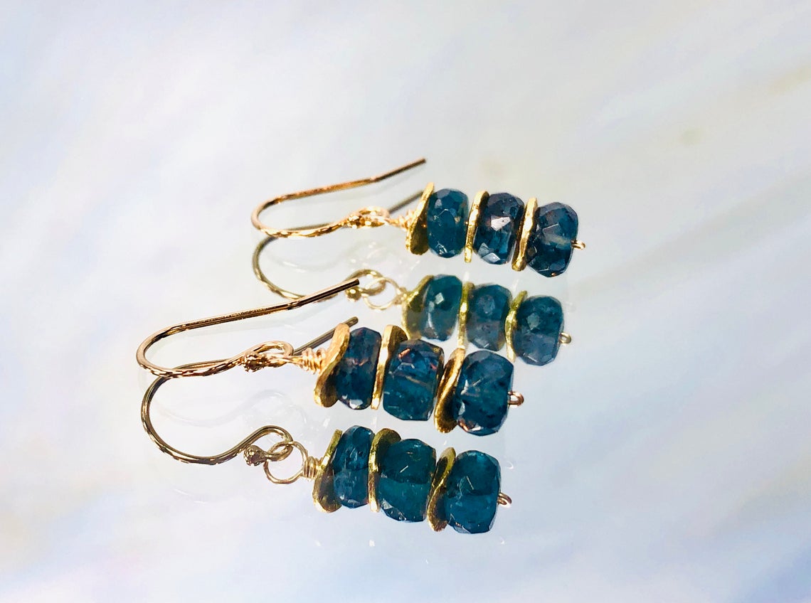 Deep teal green sparking facetted moss kyanite rondels hand from hand crafted sterling silver or Gold Fill ear wires. Dainty earrings perfect for everyday wear.