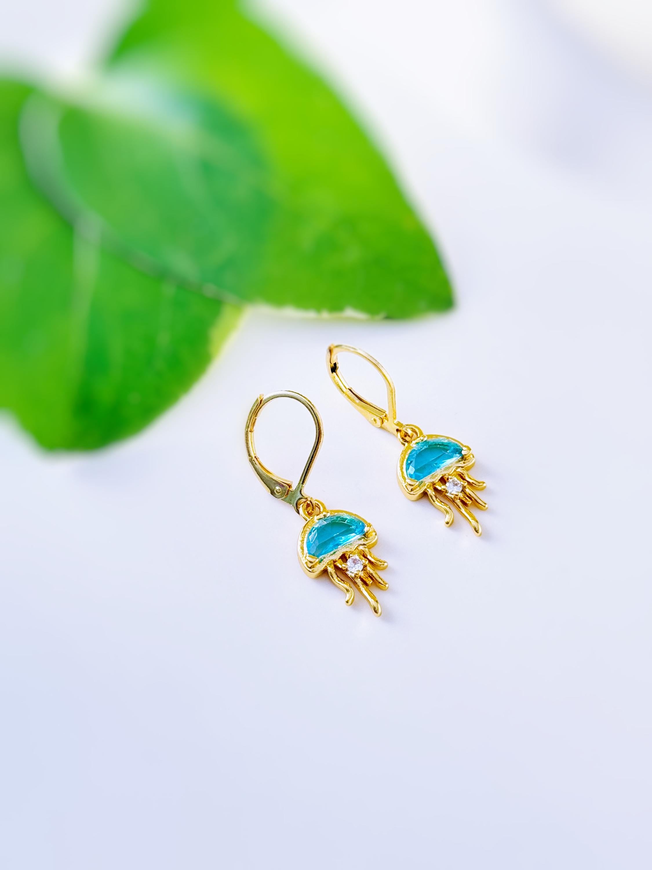 Handmade Gold Jellyfish Dangle earrings. These fun aqua blue jellyfish earrings are the perfect beach jewelry gift for surfers, swimmers, and nature lovers. 18k Gold plated jellyfish with sparkling cubic zirconia hang from Gold plated leverbacks