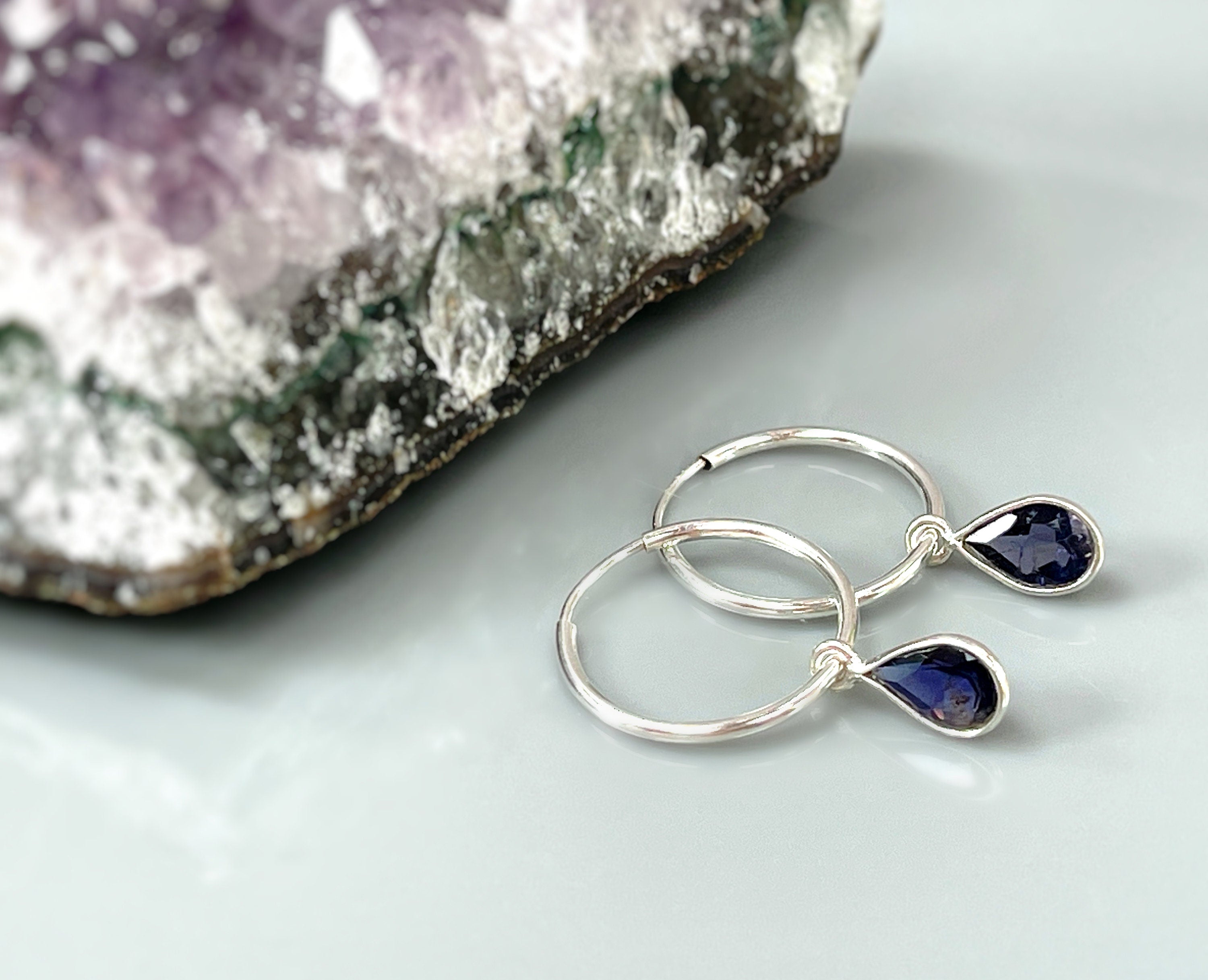 Iolite Hoop earrings Sterling Silver Dangly huggie earrings dainty gemstone earrings water sapphire handmade jewelry blue purple