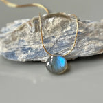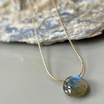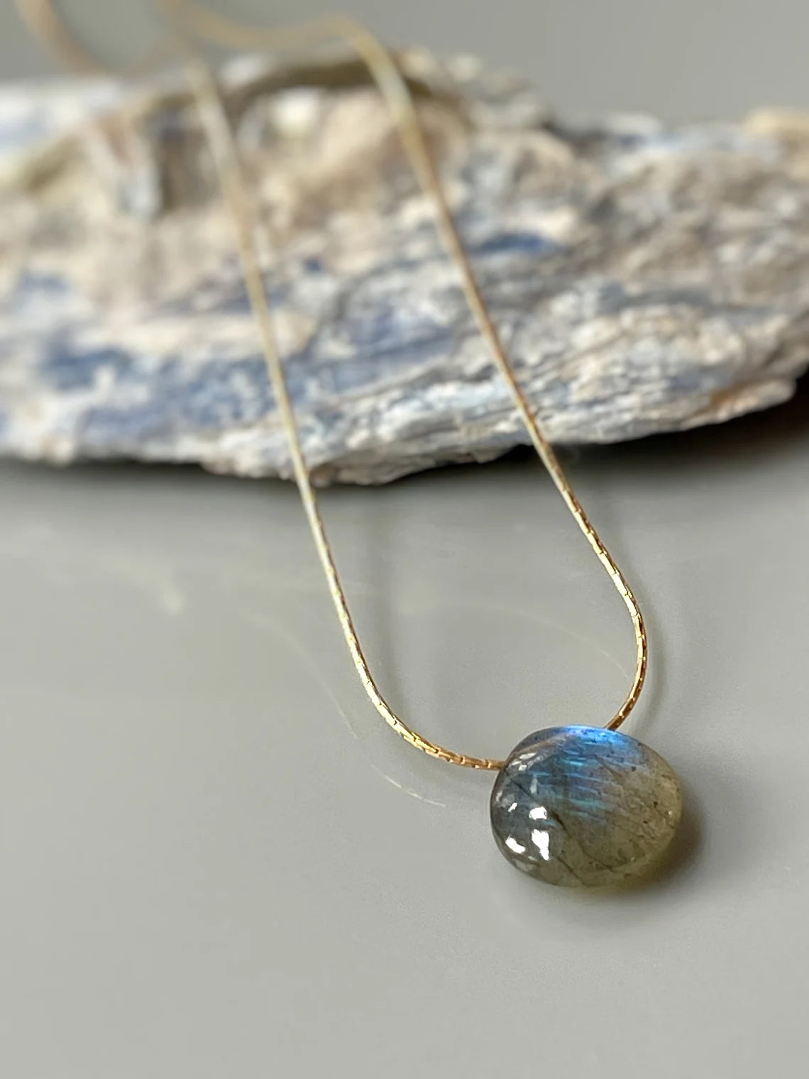 Dainty handmade labradorite solitaire pendant necklace on a delicate sterling silver or 14k gold filled chain. A simple, elegant minimalist necklace perfect for everyday wear.