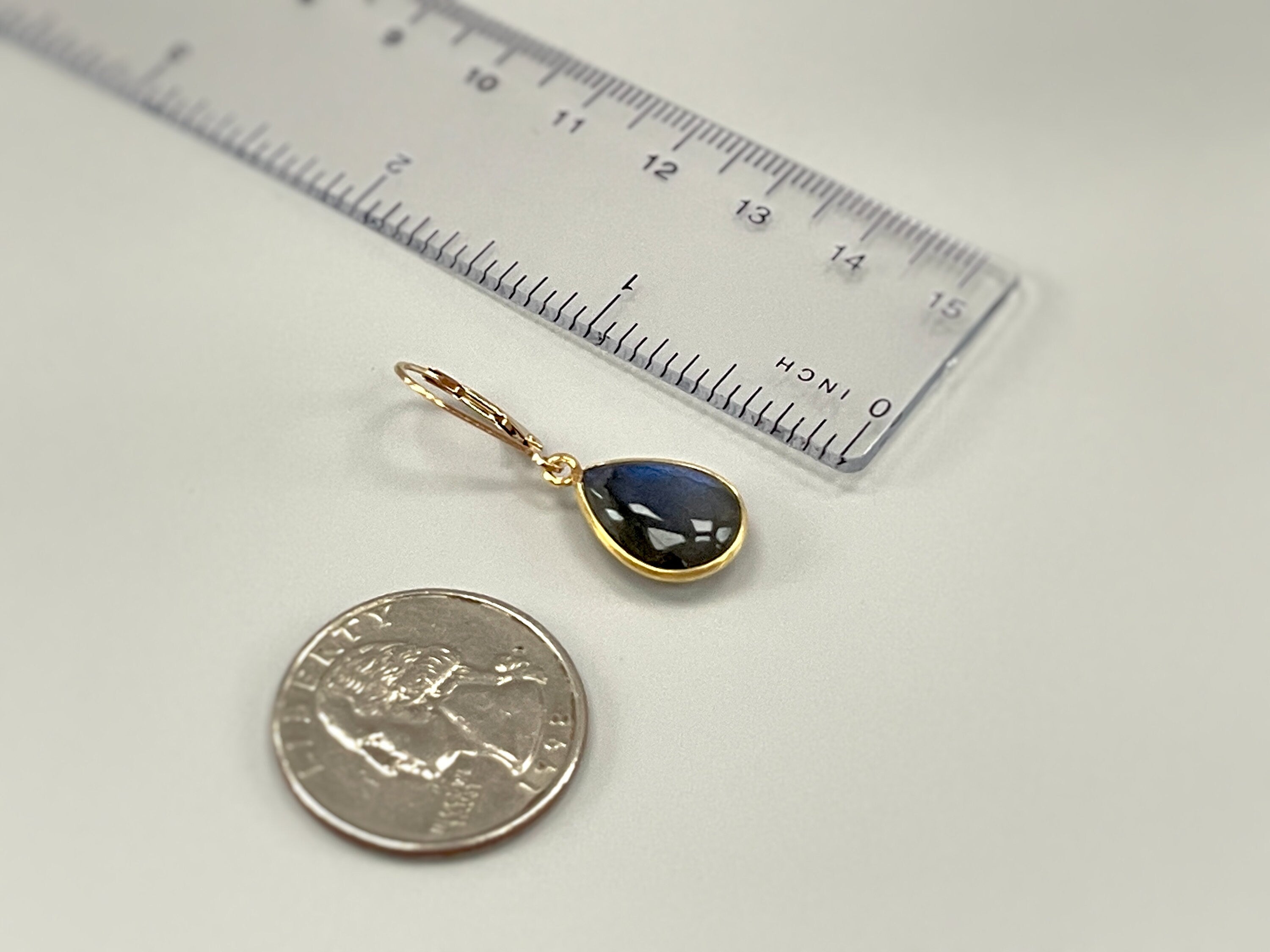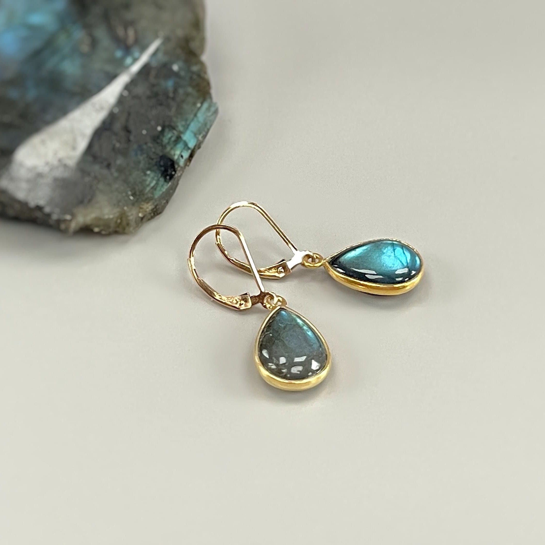 Handmade minimalist labradorite earrings. Gorgeous smooth Labradorite briolettes are set in your choice of Sterling Silver or Vermeil (14k gold over sterling silver) and hang from matching sterling silver or 14k gold fill leverbacks. Labradorite drops are approx 20mm long. Simple, elegant earrings.
