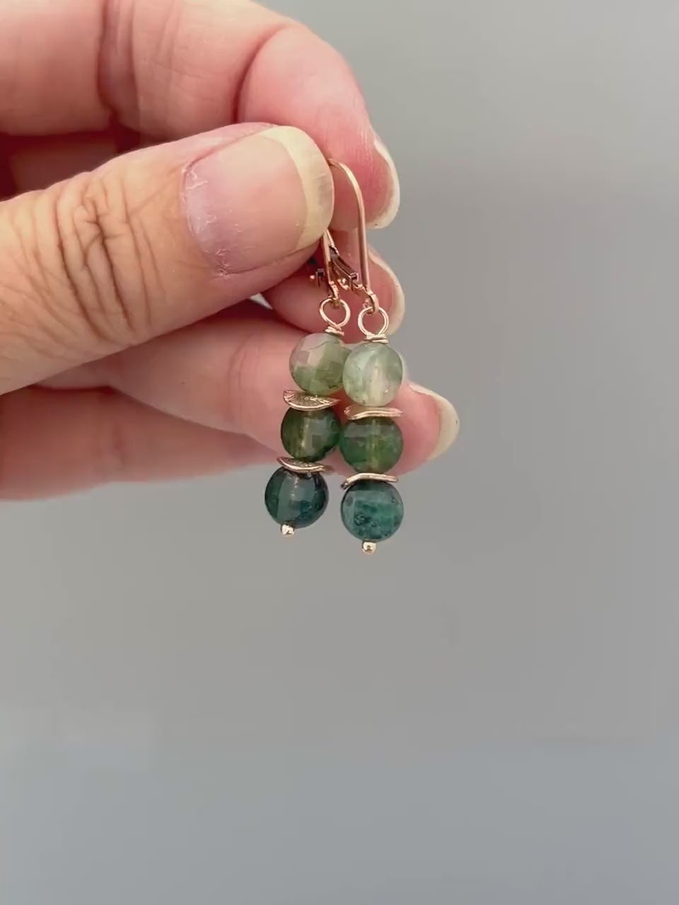 Lovely Facetted Moss Agate (also called Fern and tree Agate) rounds hang from your choice of hand crafted sterling silver, Rose Gold Fill, or 14k gold fill ear wires or leverbacks. Dainty earrings perfect for everyday wear.