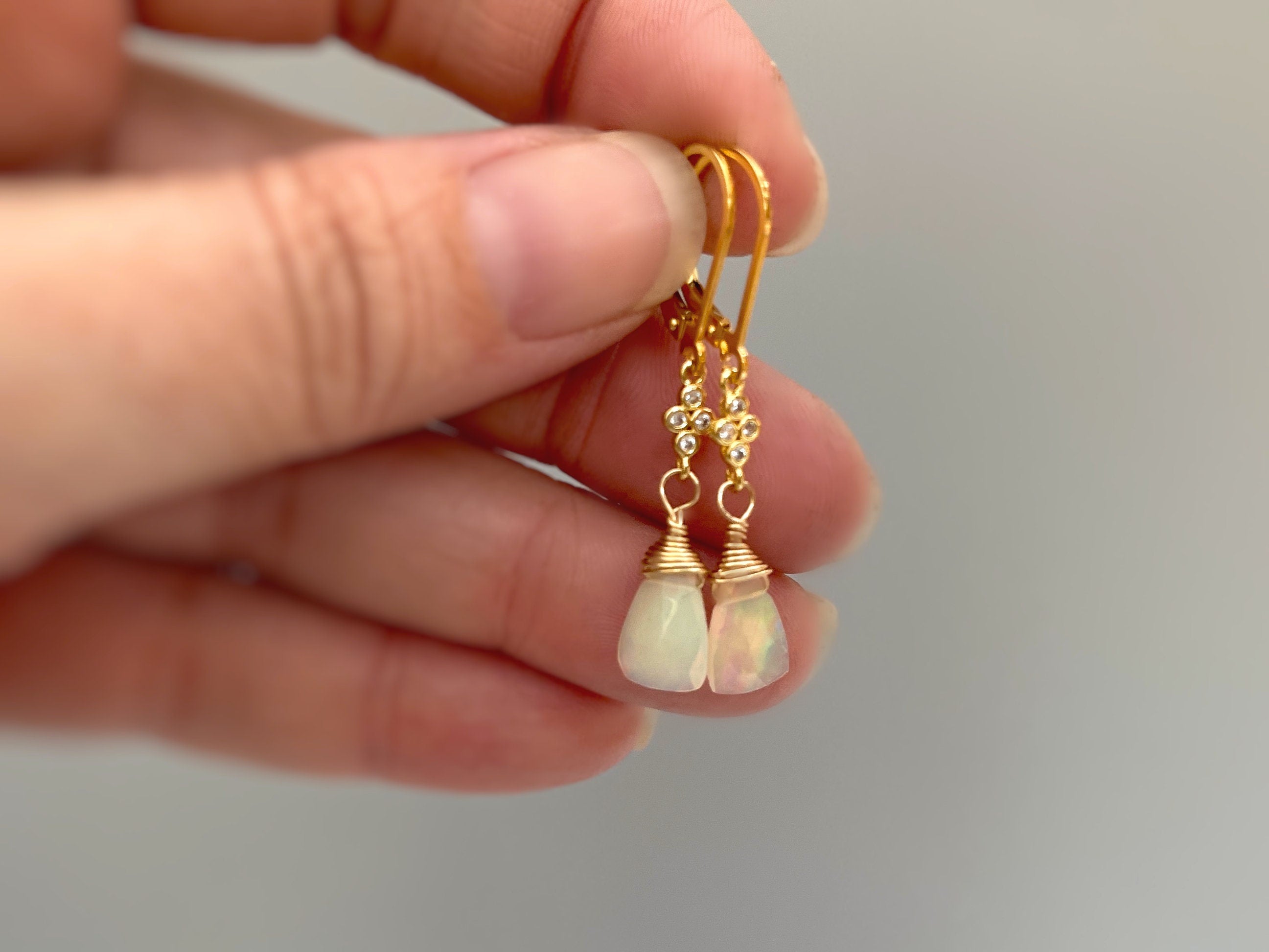 Dainty handmade genuine opal dangle earrings for women. Facetted opal gemstone wire wrapped in sterling silver, 14k Gold fill, or Rose Gold Fill hang from sparkling crystals Matching French hook or leverback earring backs available. Gemstone drops are dainty approx 8x6mm. Simple, elegant everyday earrings. These would make lovely bridal or bridesmaid gift earrings.